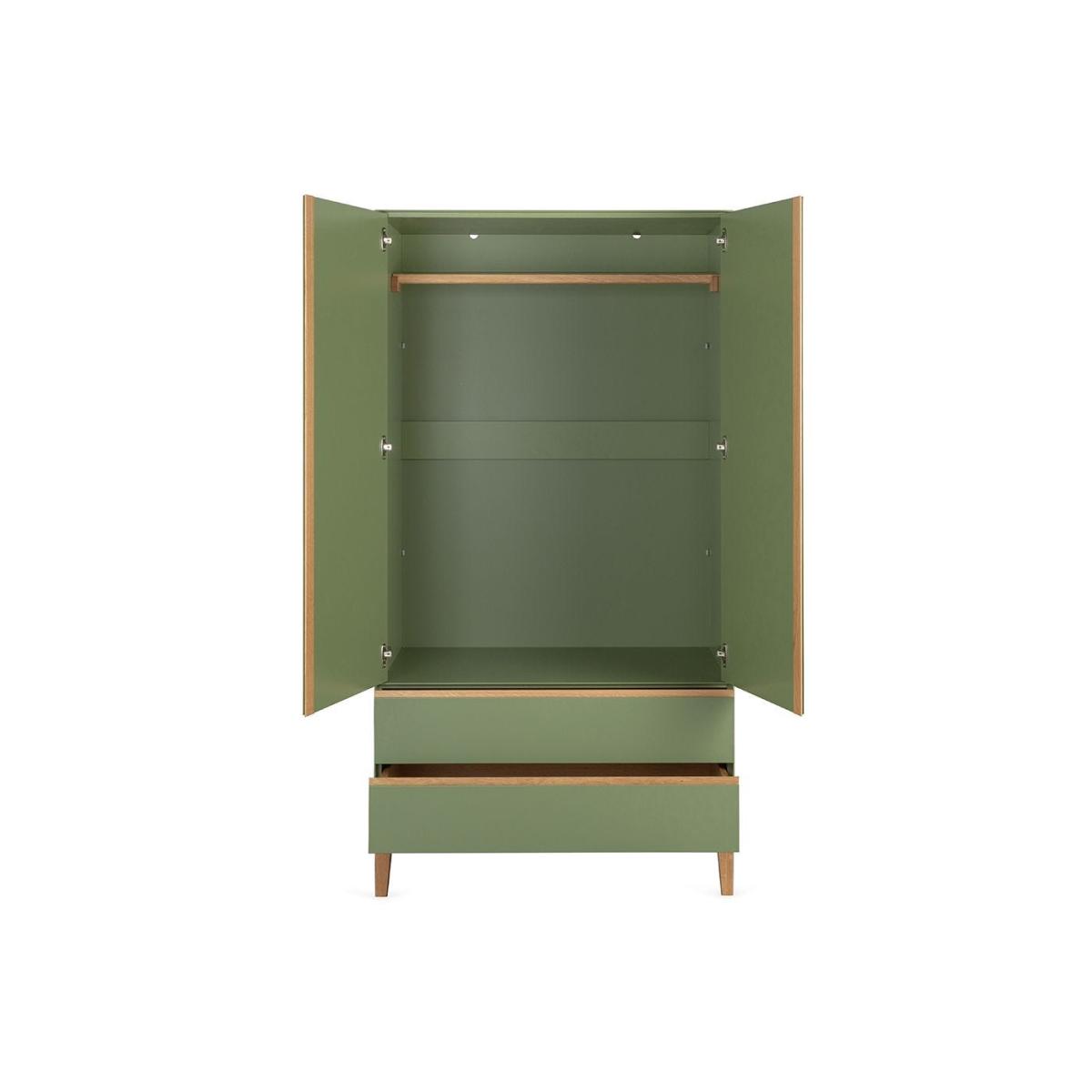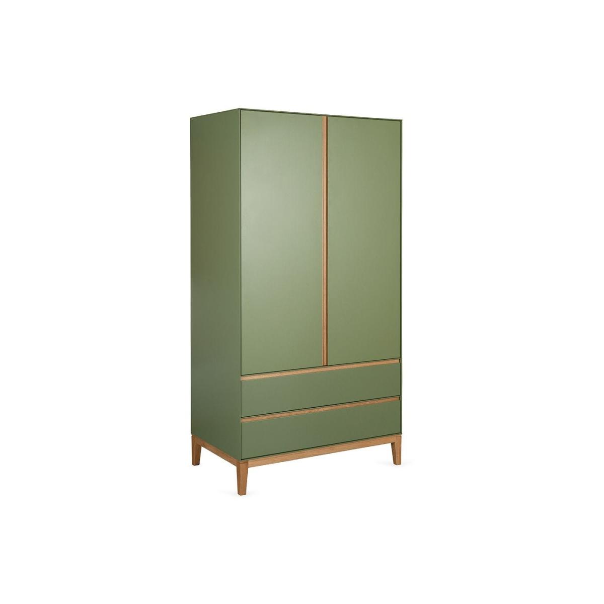 I’m a fan of the Lars wardrobe in olive green because its matt finish and streamlined silhouette bring a calm, contemporary feel without overpowering a space. It works especially well in Scandi-inspired or modern-farmhouse bedrooms, where the muted green pairs beautifully with pale oak, natural linen and brushed brass accents. For styling, keep the exterior simple - a pair of leather hooks on the side for light scarves or necklaces adds practical interest. Inside, use matching baskets or clear acrylic boxes on the top shelf to make the most of the generous storage, and choose slimline hangers to keep everything neat and uniform.