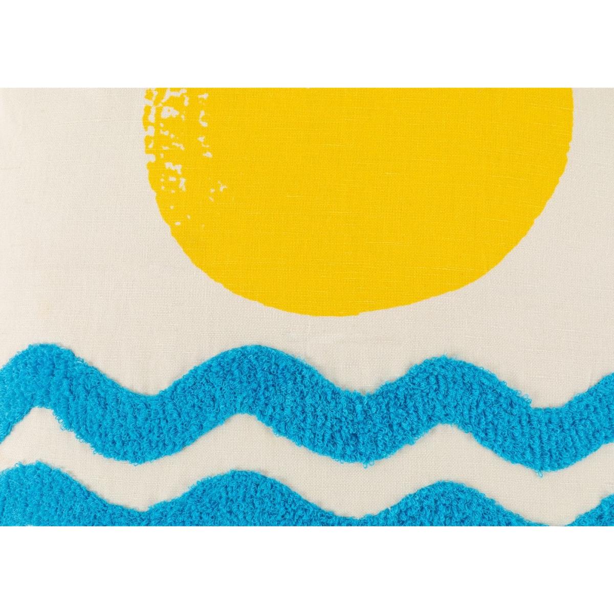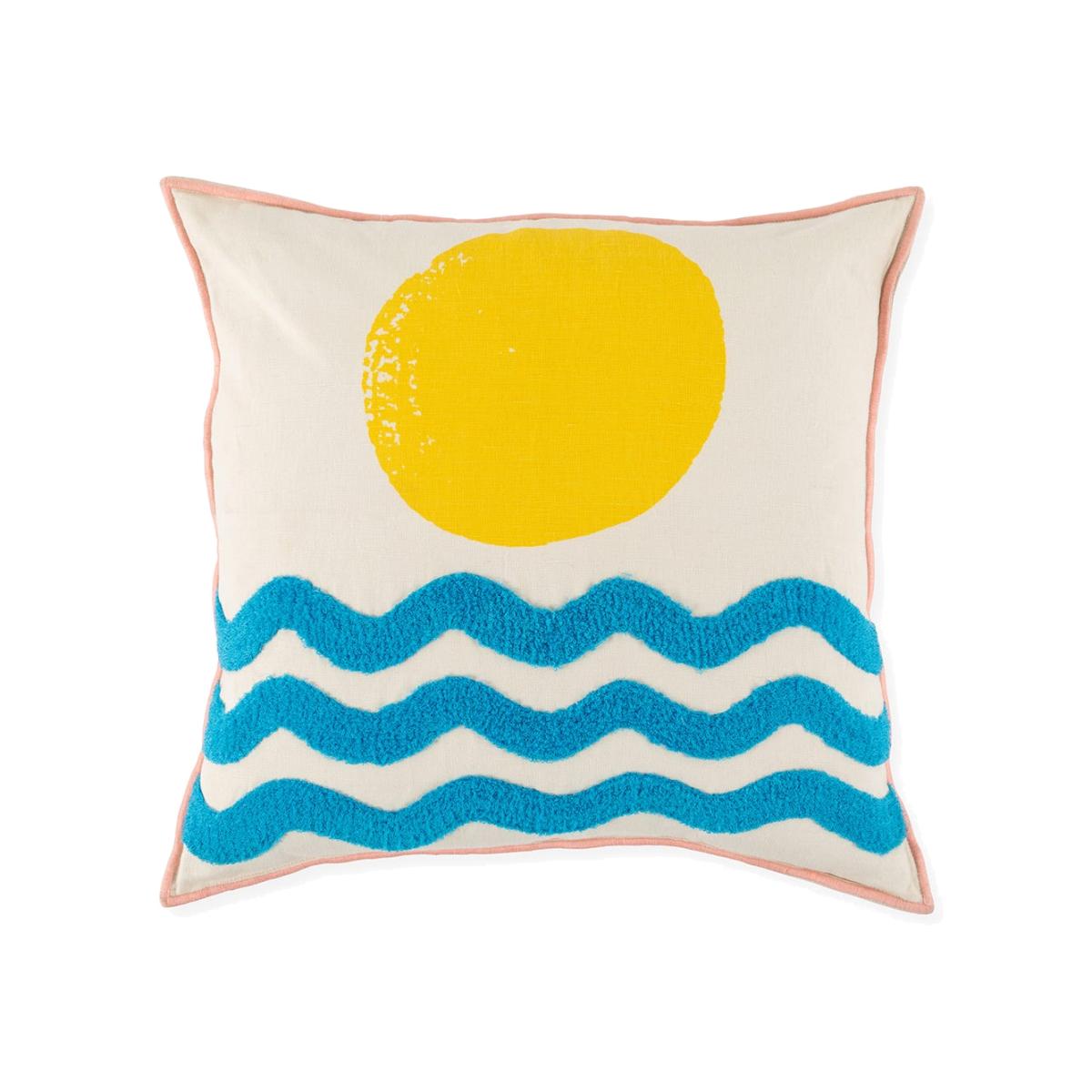 This little cushion is a great way to inject a cheerful pop of colour into both contemporary and coastal-inspired interiors. I love its bright yellow sun paired with the playful blue waves - it’s perfect for adding a summery, relaxed vibe to a sofa or armchair. Its bold design works well in neutral spaces, acting as a focal point, but it can also complement brighter colour schemes for a lively overall look. For styling tips, try pairing it with textured throws or neutral upholstery to let it stand out, or mix it with other patterned cushions to create an eclectic, layered feel. Its cheerful tone and simple graphic design make it a versatile piece to elevate your space effortlessly.