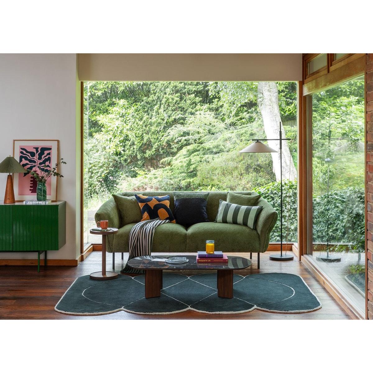 I love this cushion for adding a pop of colour and texture to a variety of interiors. Its navy and green colourway offers versatility, working well in both contemporary and more eclectic schemes. It's perfect for bringings some visual interest to neutral sofas or armchairs, and the textured knit adds a cosy, tactile element. Practical styling tips include mixing it with other cushions in different sizes and fabrics for a layered look, or pairing it with natural materials like wood or rattan to enhance its earthy vibe. It's a great choice for creating an inviting, relaxed feel in living rooms or bedrooms alike.