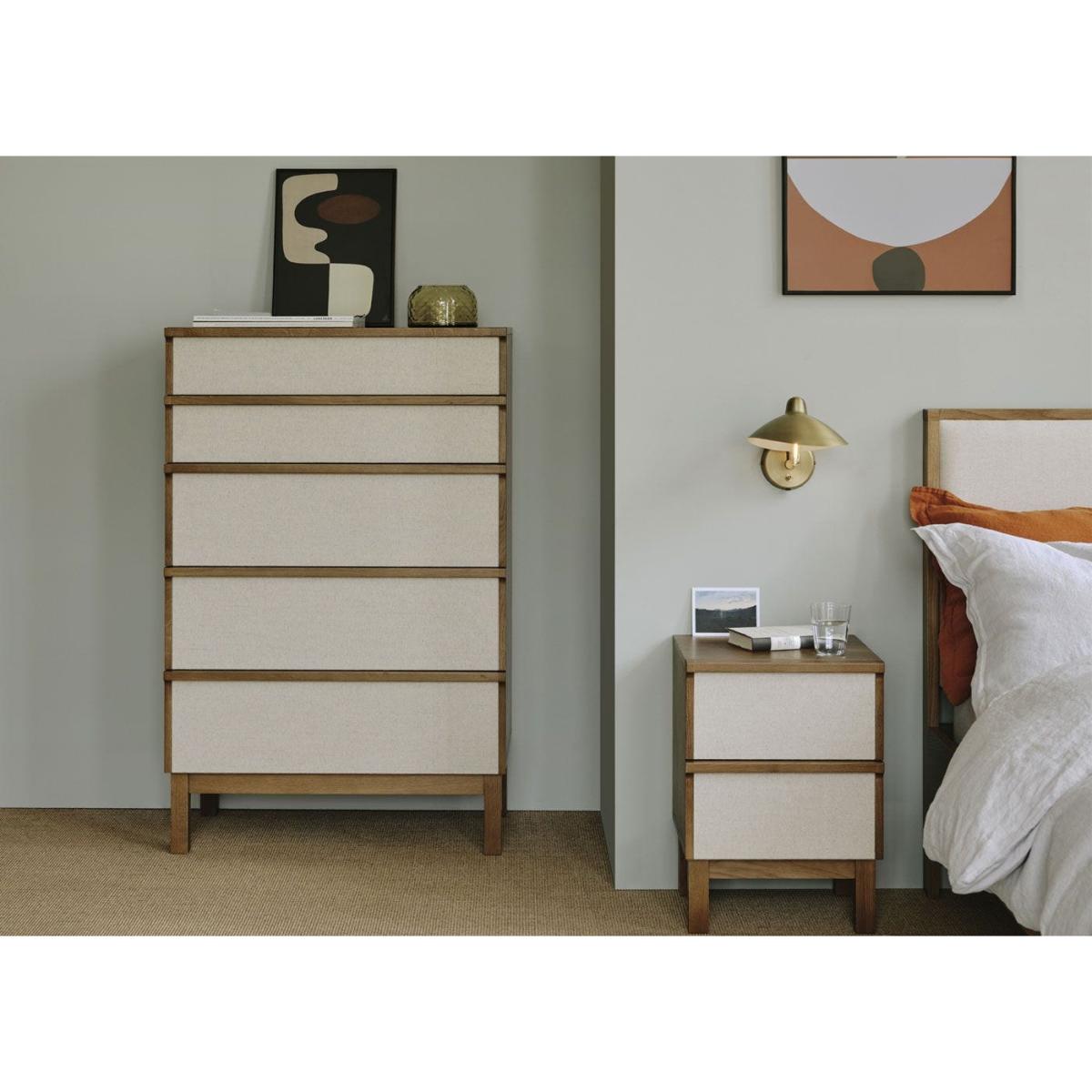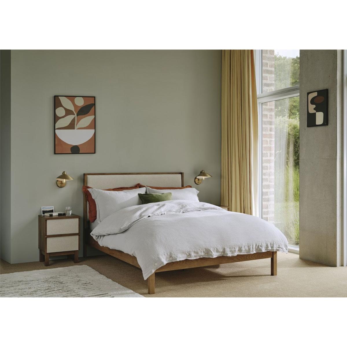 Exclusively designed for Heal's by Norwegian talent Magnus Pettersen, the Marna Bedside Table is understated and timeless, and pairs beautifully with other pieces in the collection. Combining solid and veneer oak, the table features two distinctive drawers made from soft linen in an oat shade, adding a natural feel to any space. Storage that combines simplicity with style.