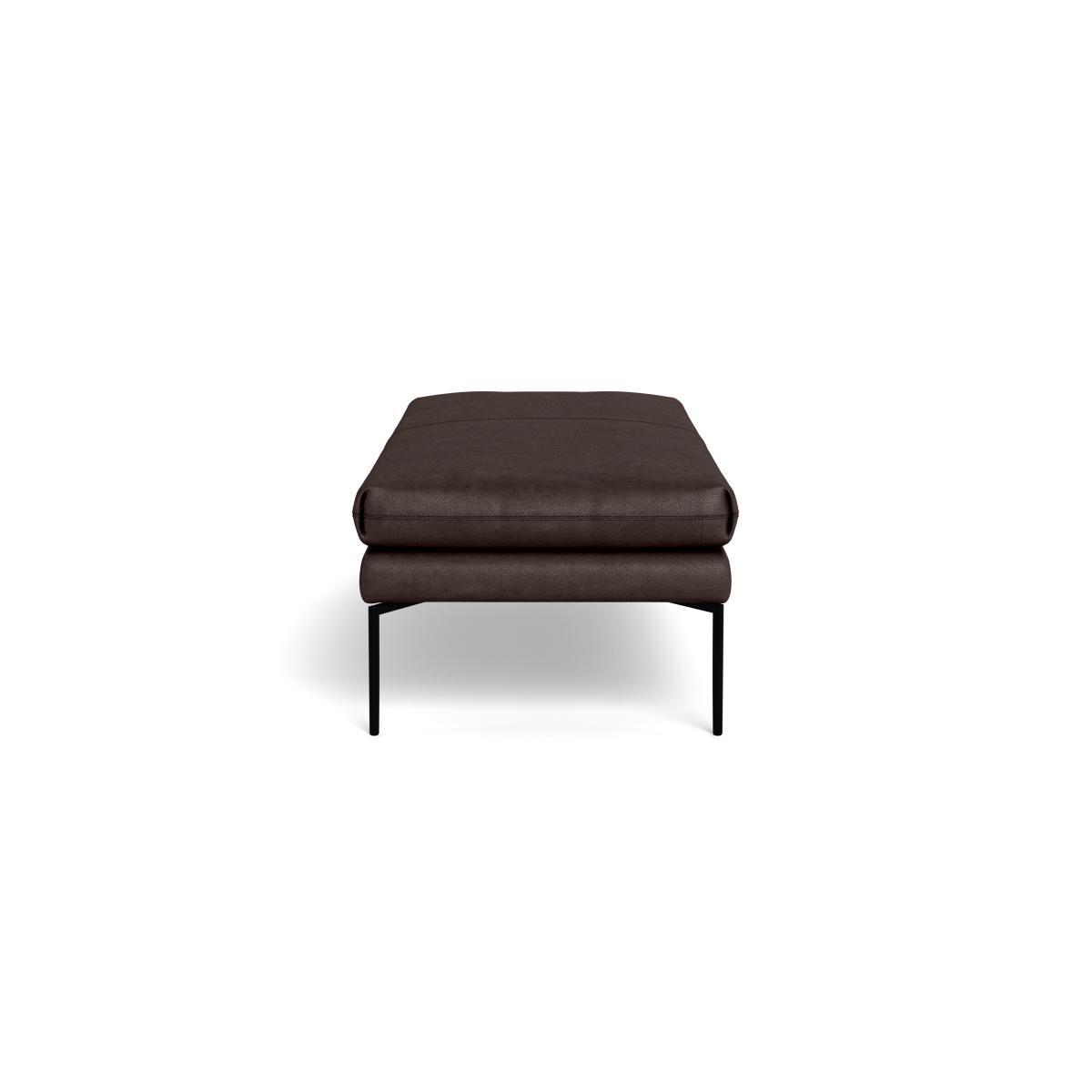 I really like this piece because it offers a sleek, modern look with its rich leather grain finish and minimalist black feet, making it versatile for both contemporary and slightly more classic interiors. It works particularly well in living rooms with neutral palettes, where it can serve as both extra seating and a stylish footrest. For styling tips, consider layering it with textured cushions or throws in complementary tones to add warmth, or pair it with a low coffee table for a functional, unfussy arrangement. Its streamlined design and rich chocolate leather make it a practical yet refined addition that can be adapted across different styles, from urban chic to cosy, lived-in interiors.