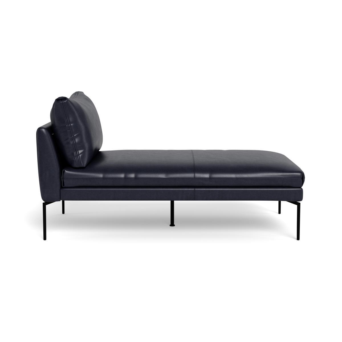 I love this chaise for its versatile, understated elegance - it works well in both modern and minimalist interiors, as well as more eclectic spaces. The leather in the stonewash black gives it a slightly distressed, lived-in feel, making it perfect for creating a cosy, inviting corner. It's a practical choice too, as leather is durable and ageing beautifully over time. For styling tips, consider pairing it with textured cushions in neutral or warm tones to soften the look, or layering with a cosy throw for added comfort. Its sleek black metal feet keep it grounded and contemporary, making it a great statement piece without overwhelming a space.
