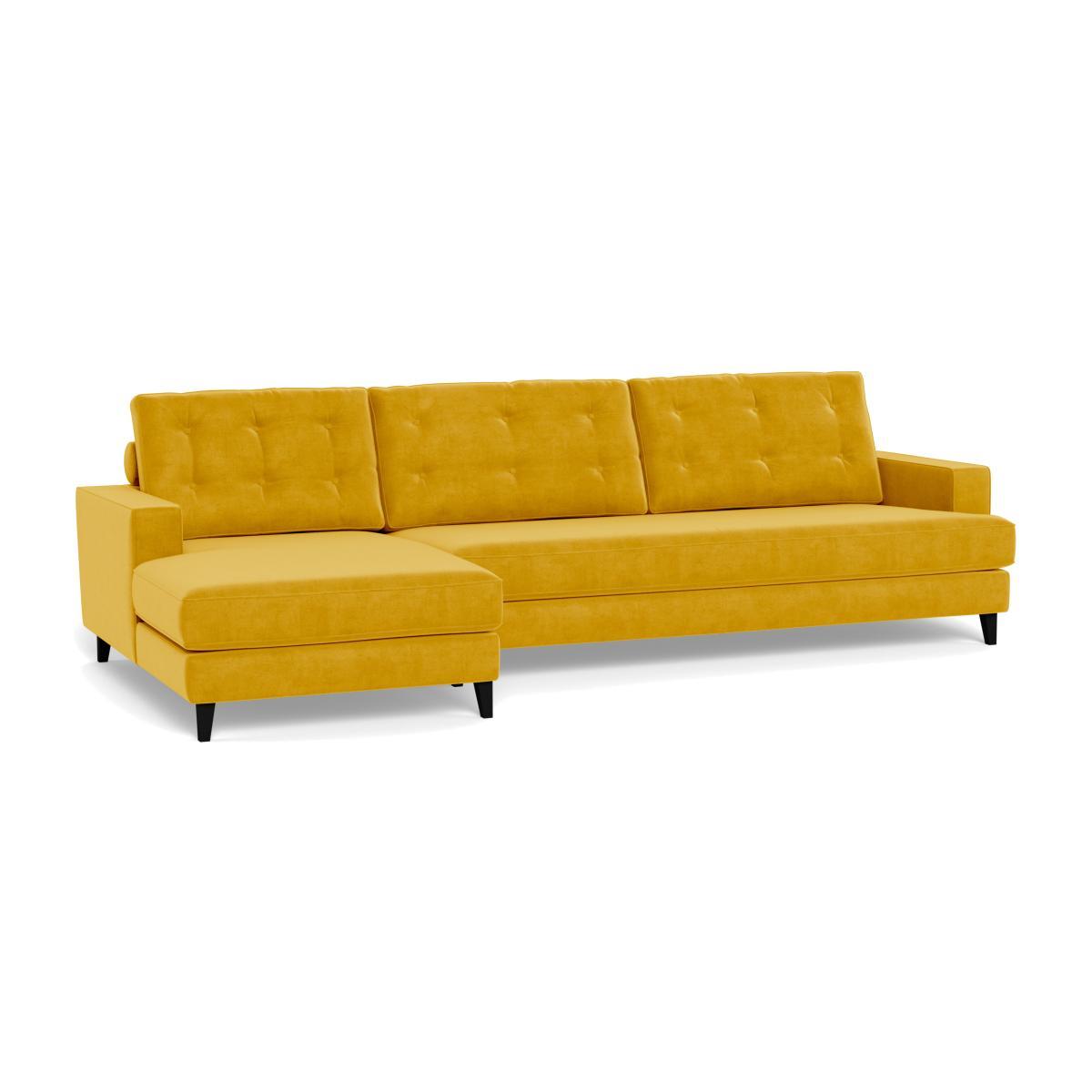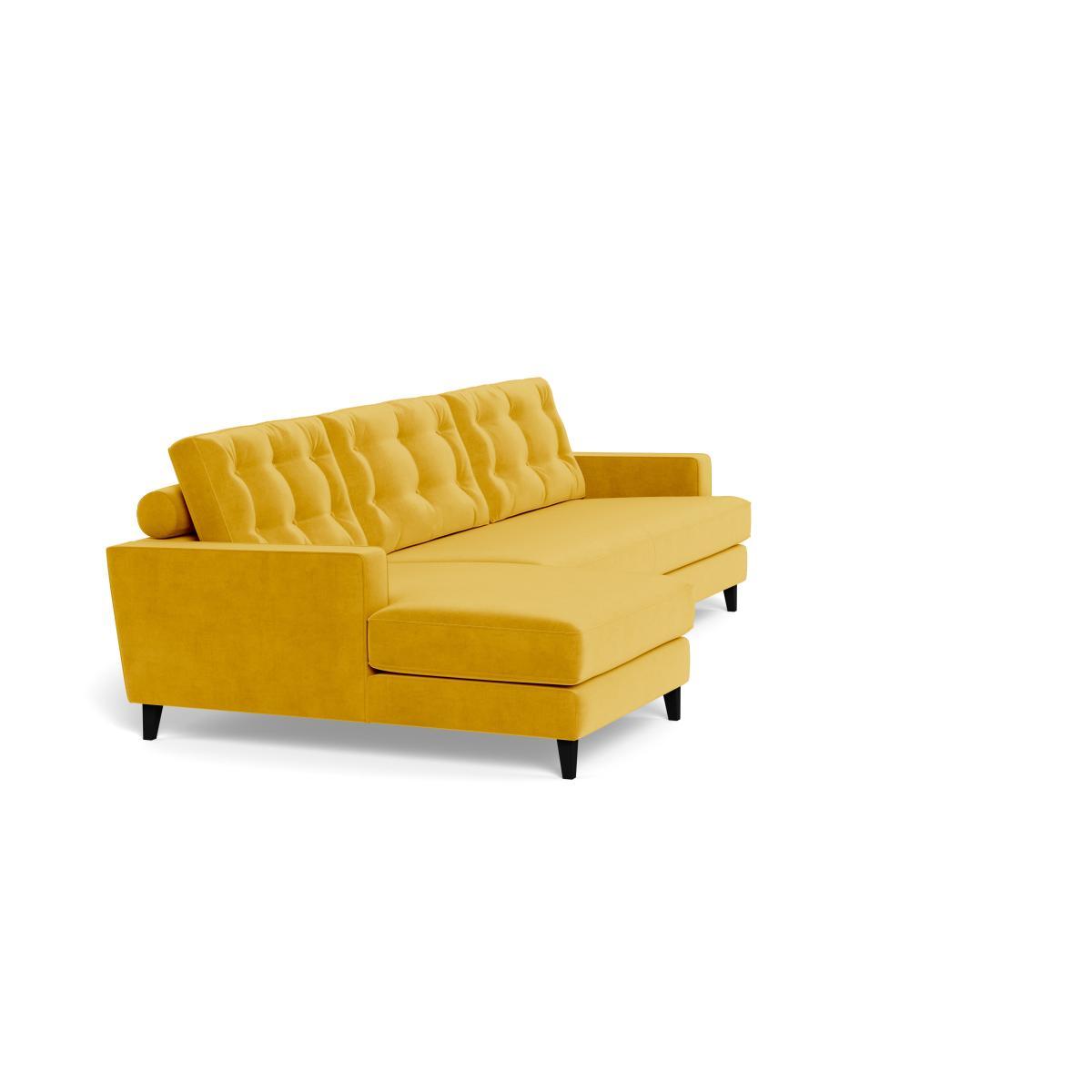 I love this corner sofa for its bold canary colour and plush velvet texture, which instantly lifts and energises a room. Its left-hand facing design makes it excellent for creating cosy, conversational spaces in larger open-plan living areas. The luxe velvet finish adds sophistication, while the natural feet give it a subtle, airy feel that works well in both modern and eclectic interiors. For styling, try pairing with neutral or complementary tones to let the sofa really stand out; adding textured cushions or throws in contrasting fabrics can also enhance the overall look. Its comfortable proportions and statement colour make it a versatile piece that works equally well in a contemporary city apartment or a chic suburban lounge.
