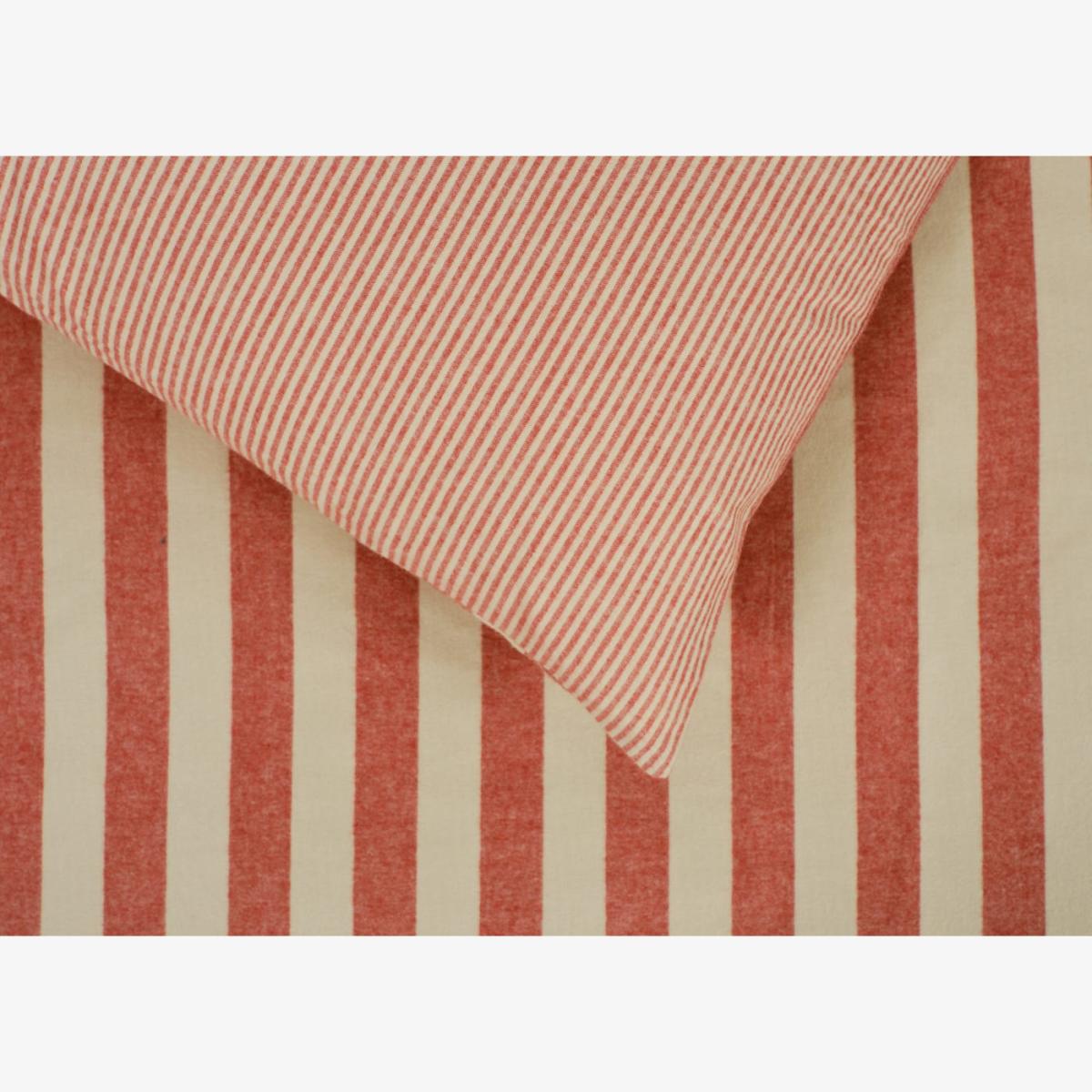 Indulge in the ultimate comfort with our Organic Cotton Flannel Stripe Bed Linen Set in Red. Woven in Portugal from 100% organic cotton, this brushed flannel set is incredibly soft and cosy. Featuring a reversible design, it offers two stylish looks: a mini stripe on one side and a bold stripe on the other. The duvet cover has a convenient button close, and the pillowcases feature an envelope close, ensuring a snug fit. Perfect for adding a touch of warmth and style to your bedroom.