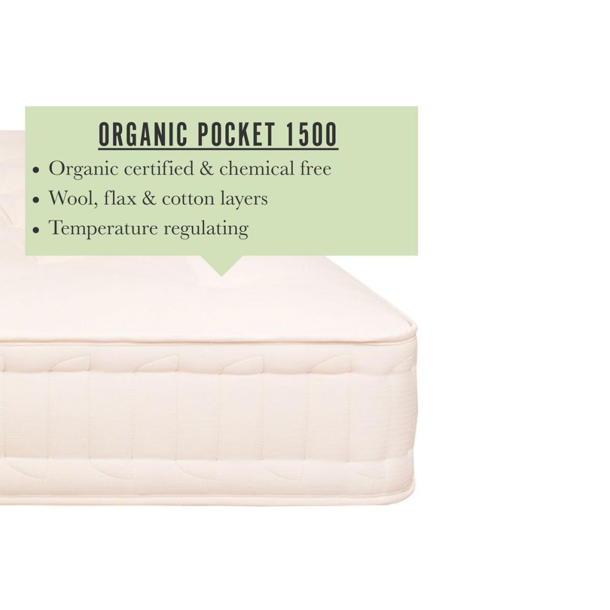The Organic Pocket 1500 is our most natural mattress to date and is handmade in Lancashire at a factory that has been awarded the Manufacturing Guild Mark presented to Britain's top 50 furniture and furnishing manufacturers. Such attention to detail begins with the fillings, a mixture of organic wool, cotton and flax that is grown without the use of harmful pesticides or chemicals for a healthier, naturally temperature regulated sleep. Available in soft, medium or firm tension, each mattress features 1500 traditionally honeycomb nested pocket springs that offer independent support for each sleeper, and minimise roll together. Upholstered in a subtle, chevron pattern on organic cotton, each Organic Pocket 1500 is tufted and side stitched by hand before being finished with solid nickel ventilators for added breathability.