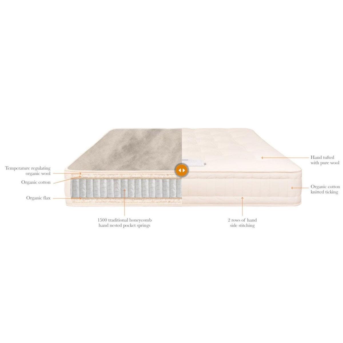 The Organic Pocket 1500 is our most natural mattress to date and is handmade in Lancashire at a factory that has been awarded the Manufacturing Guild Mark presented to Britain's top 50 furniture and furnishing manufacturers. Such attention to detail begins with the fillings, a mixture of organic wool, cotton and flax that is grown without the use of harmful pesticides or chemicals for a healthier, naturally temperature regulated sleep. Available in soft, medium or firm tension, each mattress features 1500 traditionally honeycomb nested pocket springs that offer independent support for each sleeper, and minimise roll together. Upholstered in a subtle, chevron pattern on organic cotton, each Organic Pocket 1500 is tufted and side stitched by hand before being finished with solid nickel ventilators for added breathability.