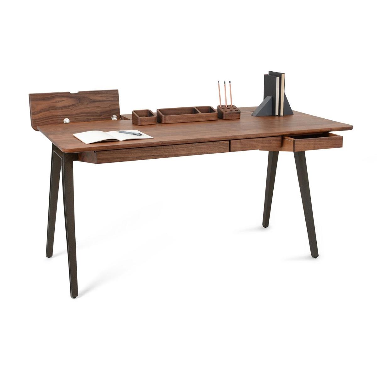 A finely balanced yet robust design from Matthew Hilton, the Orson Desk has an almost cantilevered silhouette with a curved top and angular underside that rests on a solid cast-iron frame. Exquisitely handcrafted at De La Espada’s workshops in Portugal, and finished in Danish oil to provide a smooth feel that matches the seamless joinery while showing off the intricate wood grain.