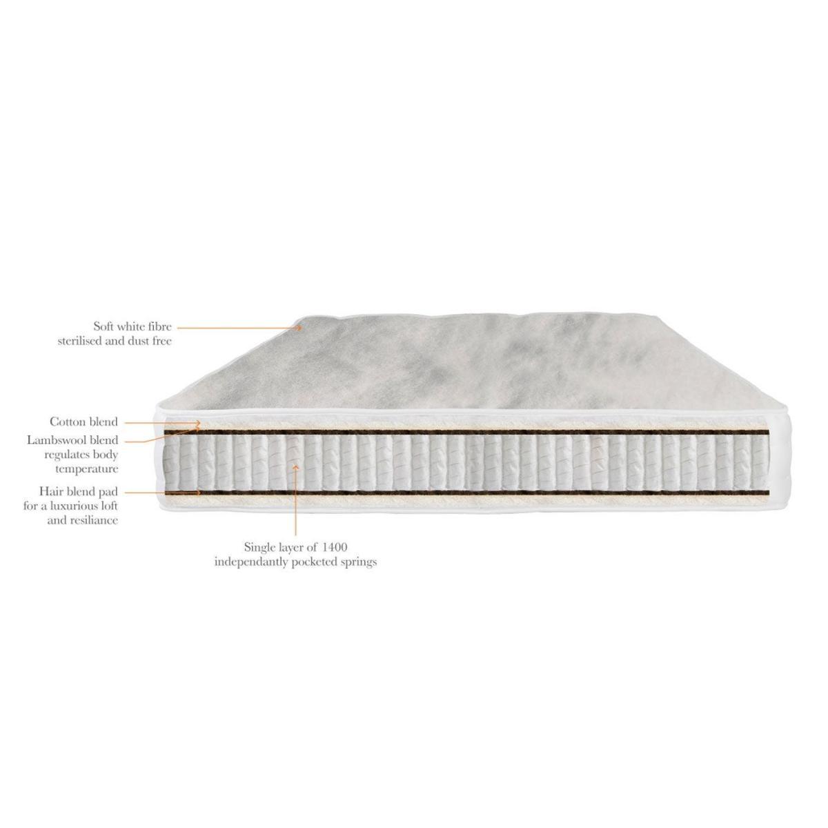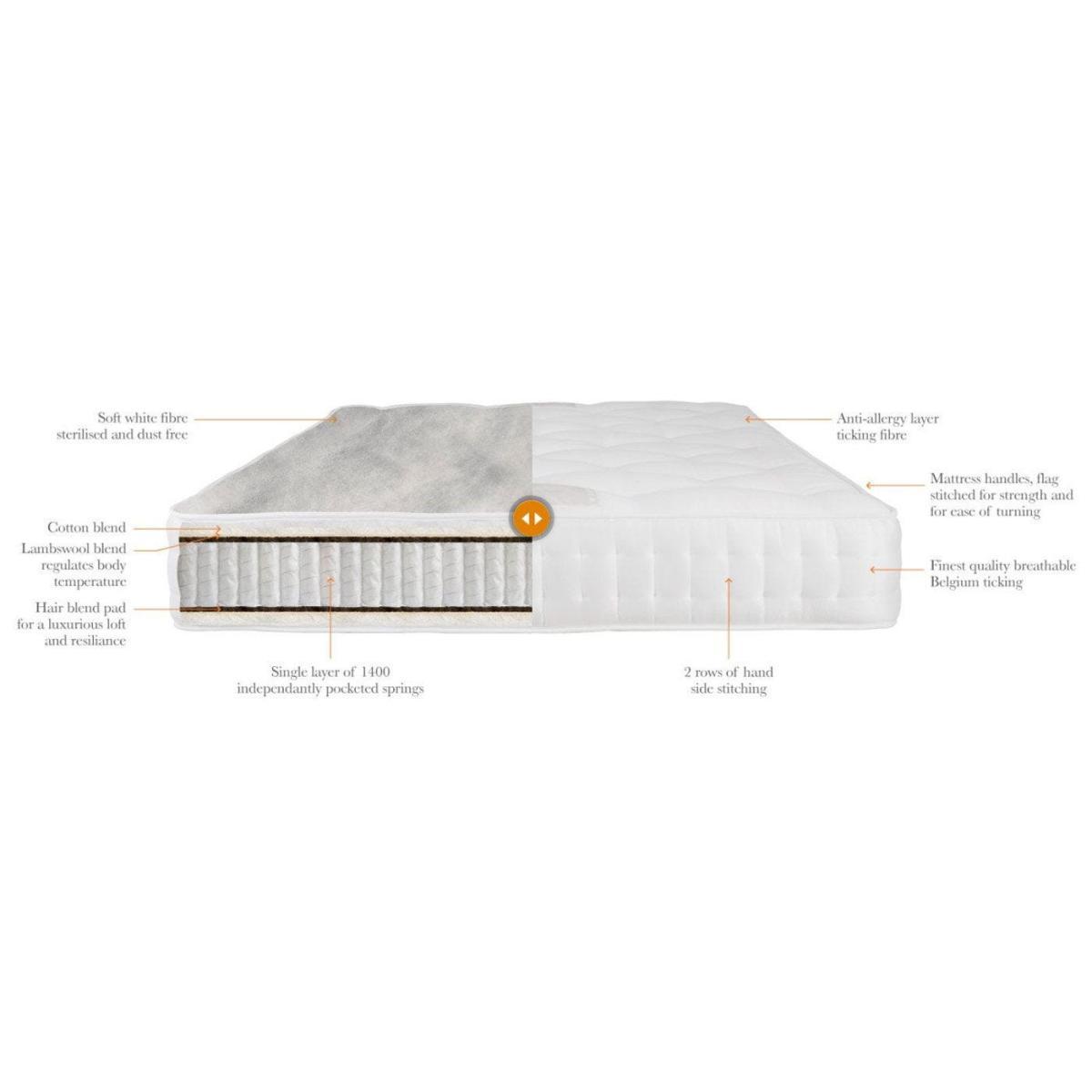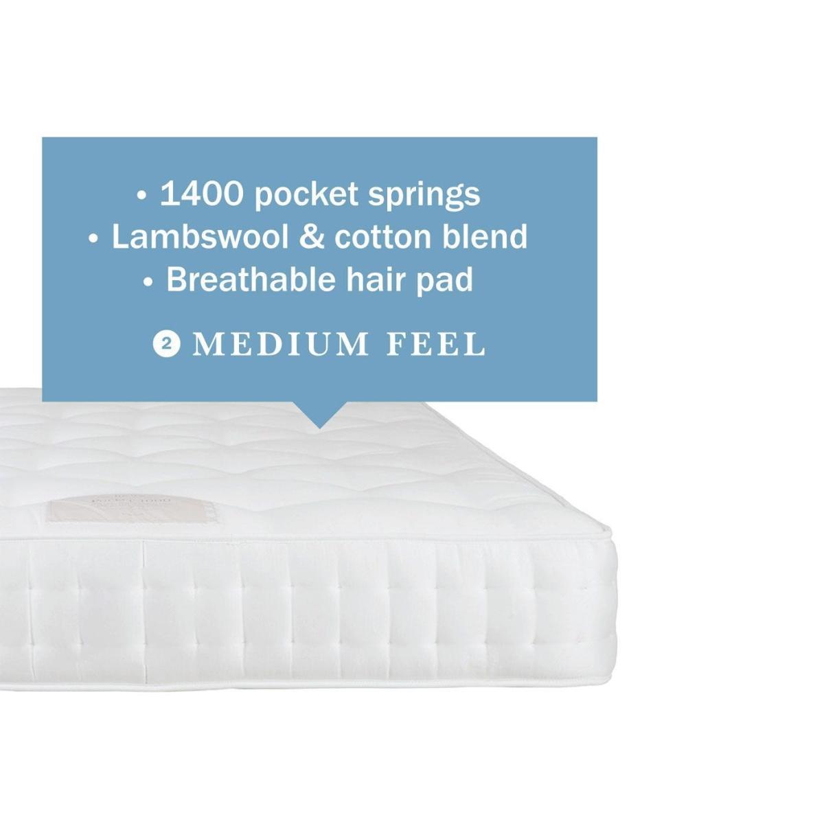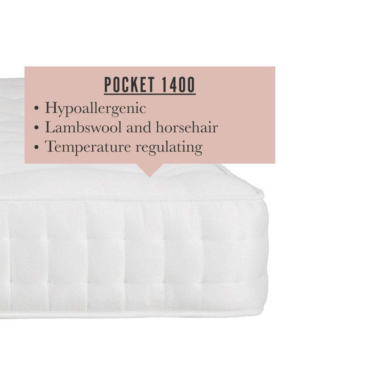 Handmade in Somerset, the Pocket 1400 mattress features the most luxuriously soft natural fillings including lambswool, animal hair, soft white fibre and cotton - this, combined with 1400 pocket springs creates a supportive but gentle feel. Individually encased in hard wearing fabric pockets, hundreds of springs have been hand-nested into the frame, moving independently from one another to mould to your natural contours. Each Pocket 1400 mattress has the added benefit of a hypo-allergenic layer which works to protect your mattress from dust mites, creating a healthy sleeping environment. Beautifully tailored in a luxurious fabric, all of the sumptuous fillings are held together with traditional hand tufting and side stitching which protects against wear and offers maximum durability. From the moment John Harris Heal first introduced London to feather filled mattresses back in 1810, we've continued to produce exquisitely designed pieces for the bedroom. Pairing individually pocketed springs with the finest natural fillings, the Pocket 1400 is a medium tension mattress that offers a traditional feel as well as luxurious comfort and support.