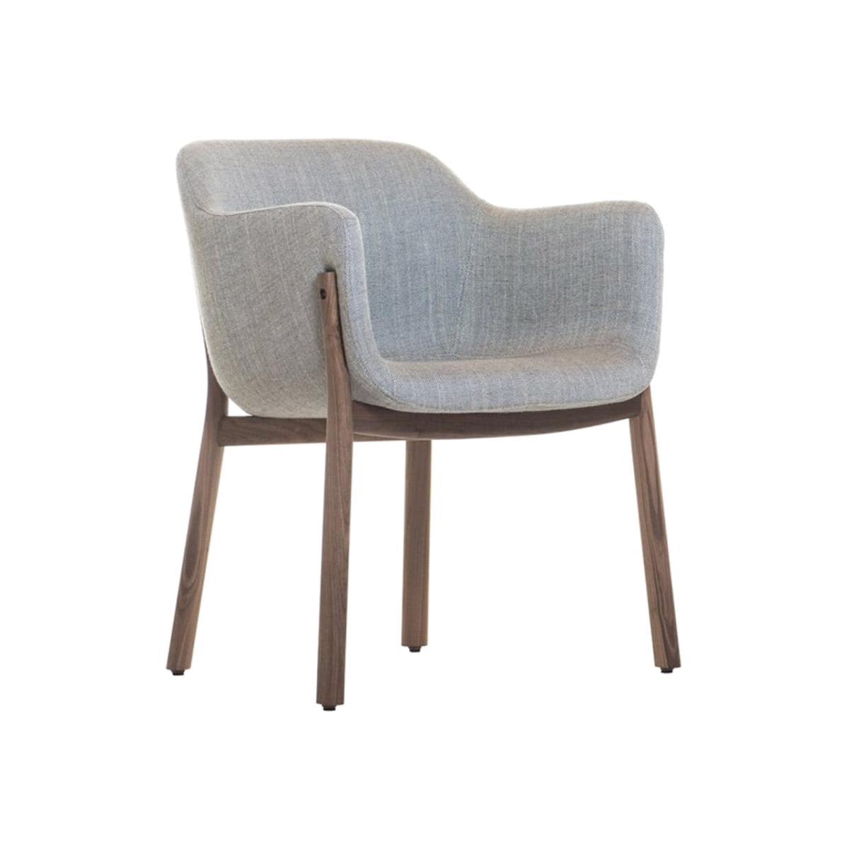 Carved from American black walnut that is finished in Danish oil, the Porto's distinctive frame contrasts Matthew Hilton's modern form with the classic craft of De La Espada. Available in a range of contemporary toned fabrics, the upholstered shell creates an enveloping seat with gentle curves connecting along its back and armrests. Set at a gentle recline to provide a relaxed sit, this comforting chair functions just as well as a piece for the dining room as an occasional chair.