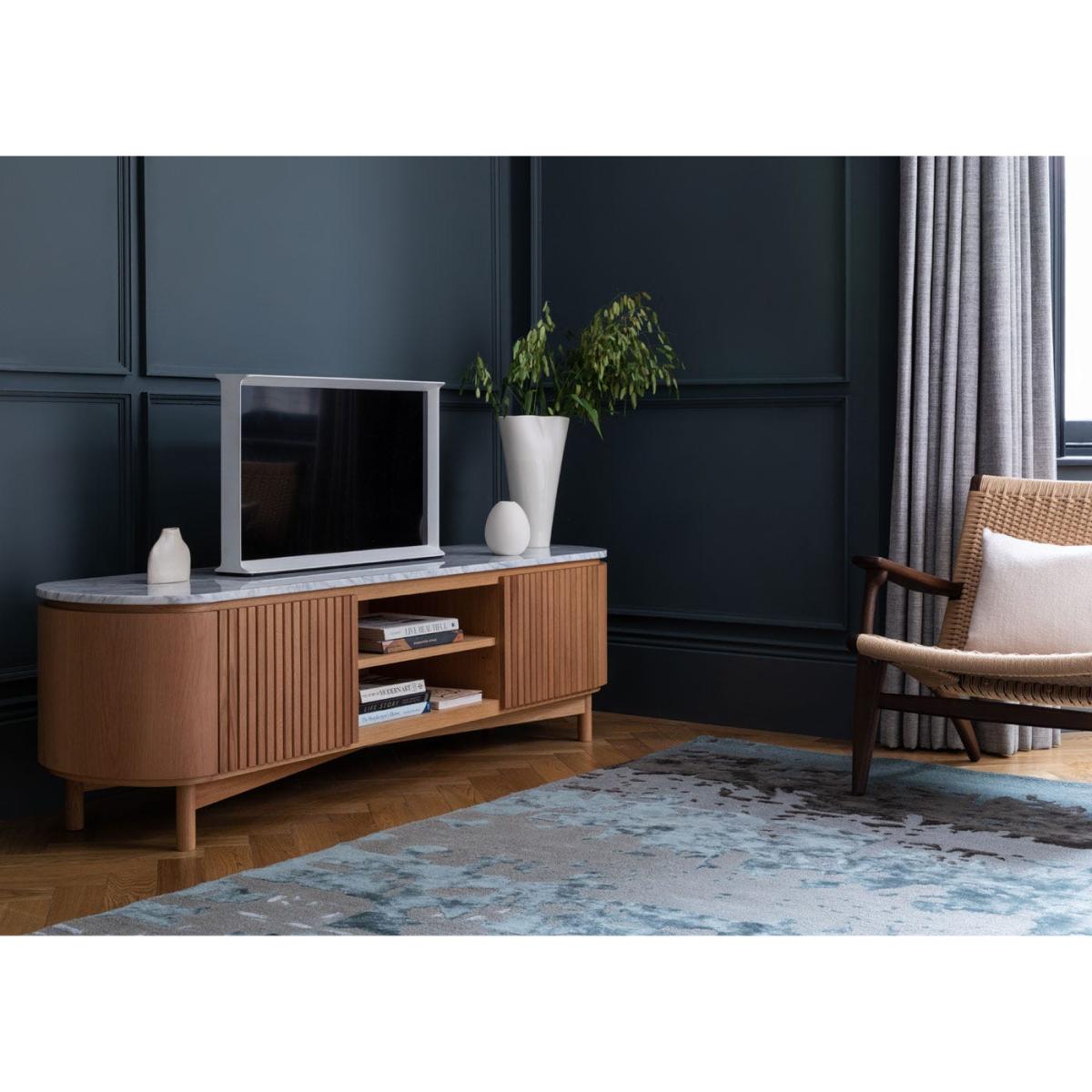 I love this media unit for its combination of rich walnut and striking black marble, which creates a contemporary yet timeless look. It works particularly well in modern or Scandinavian-inspired interiors where natural materials and clean lines dominate. The design’s practical features, like the open shelving and concealed storage, make it versatile for organising media equipment and essentials without clutter. For styling, consider keeping the top clear for statement accessories or art pieces, and balance the warmth of the wood with textured textiles or soft lighting nearby. It’s a statement piece that anchors a living space while offering effortless functionality.