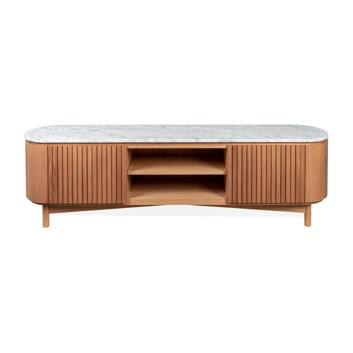 The Remi AV Unit is available in two different sizes and two different finishes - oak with white marble or walnut with black marble. The AV unit provides the perfect stylish base on which to display your television and media devices. Incredibly on trend, the design boasts a grained wood body and a solid wood body finished with statement slats. Each unit is completely unique thanks to the marble’s veining.