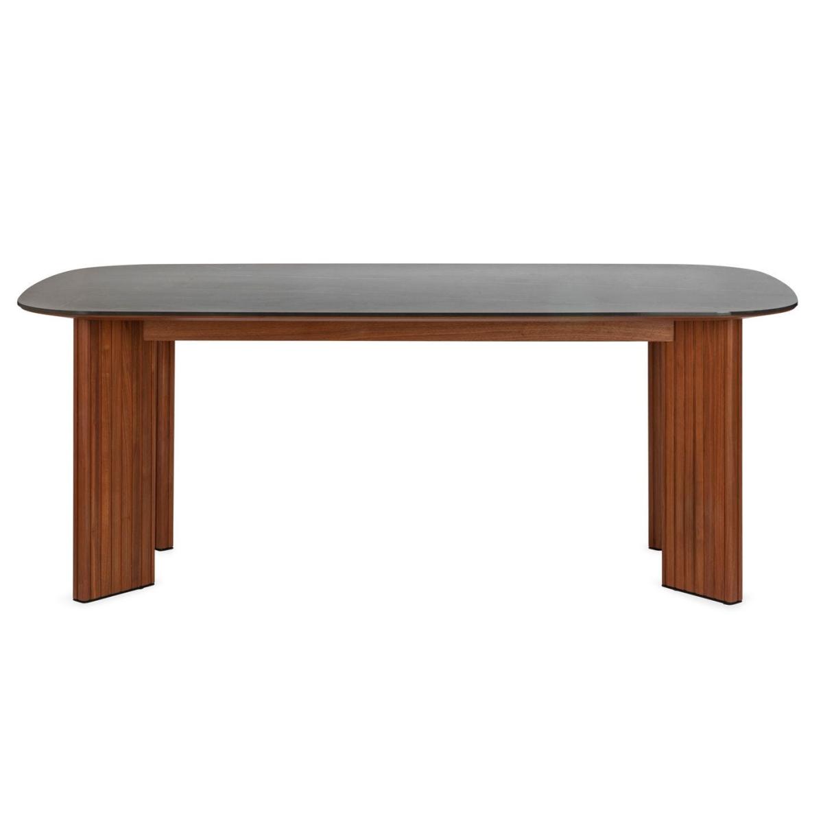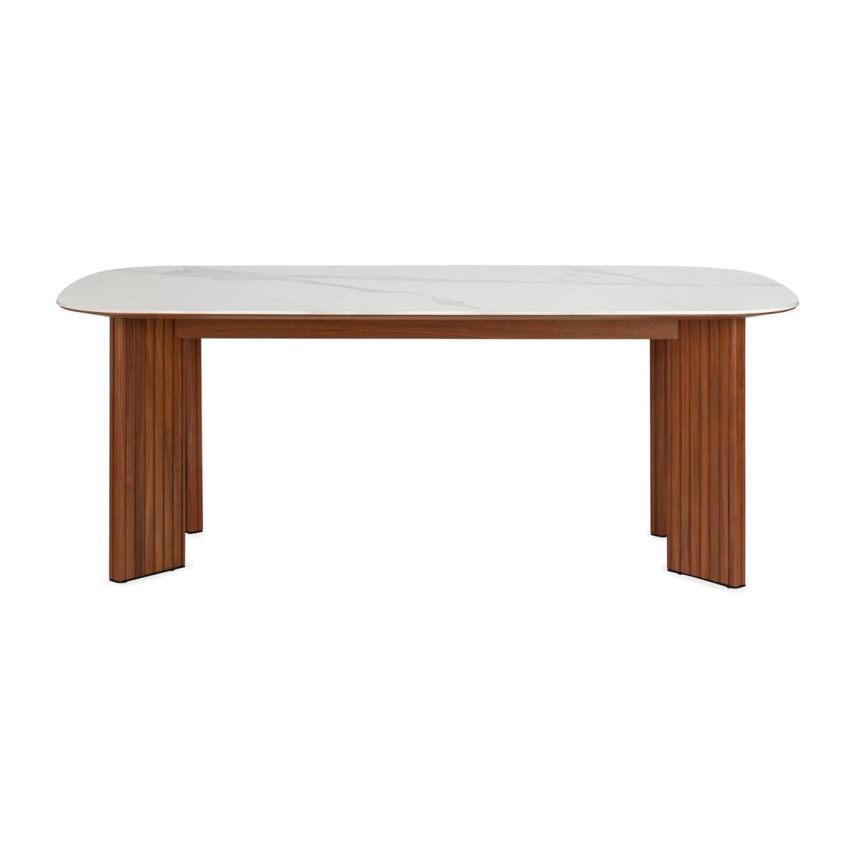I love how the Riga table brings together a crisp white ceramic top and warm fluted walnut legs - it’s both durable for daily use and quietly sculptural. Its clean lines suit modern, Scandi and mid-century inspired dining rooms, and the neutral palette makes it easy to layer in different colour stories. For styling, keep the centre of the table clear to let the ceramic surface shine; a slender runner or individual woven placemats adds texture without clutter. Pair with dark-toned chairs for contrast, hang a simple pendant light above to highlight the tabletop and introduce a single sculptural vase or low planter to ground the look.