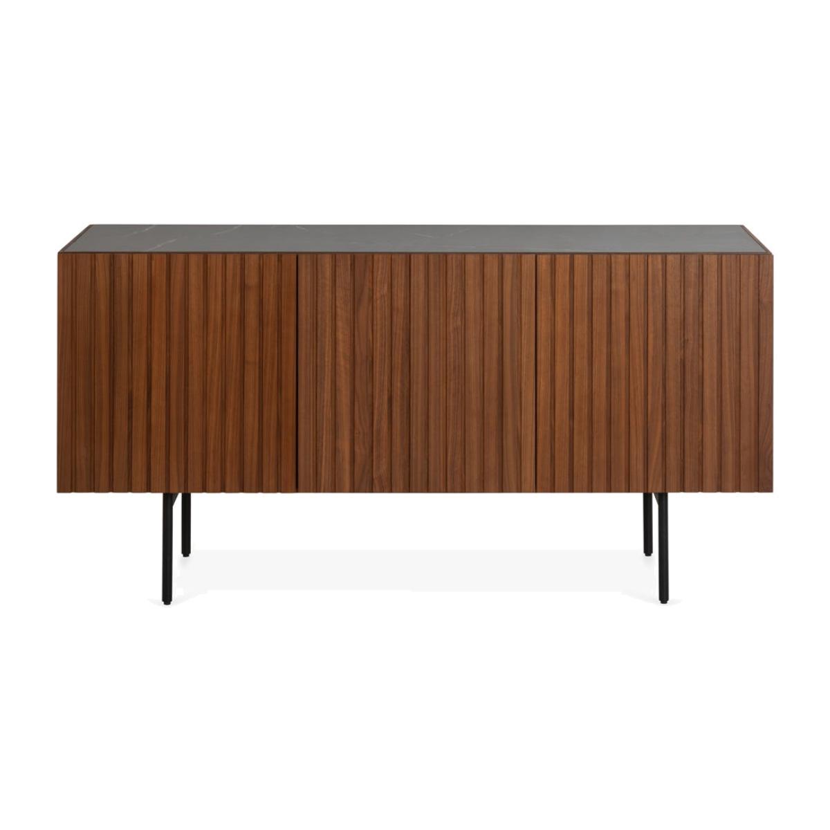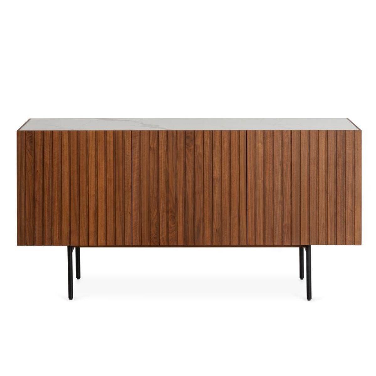 Comprising a sideboard, dining table, side table, dining chair, AV unit and coffee table, the Riga collection demonstrates a mastery of premium materials, combining solid and veneered walnut with elegant ceramic. The entire range is characterised by its signature slats, from the front of the sideboard to the legs on the tables, complete with grey or white ceramic tops.