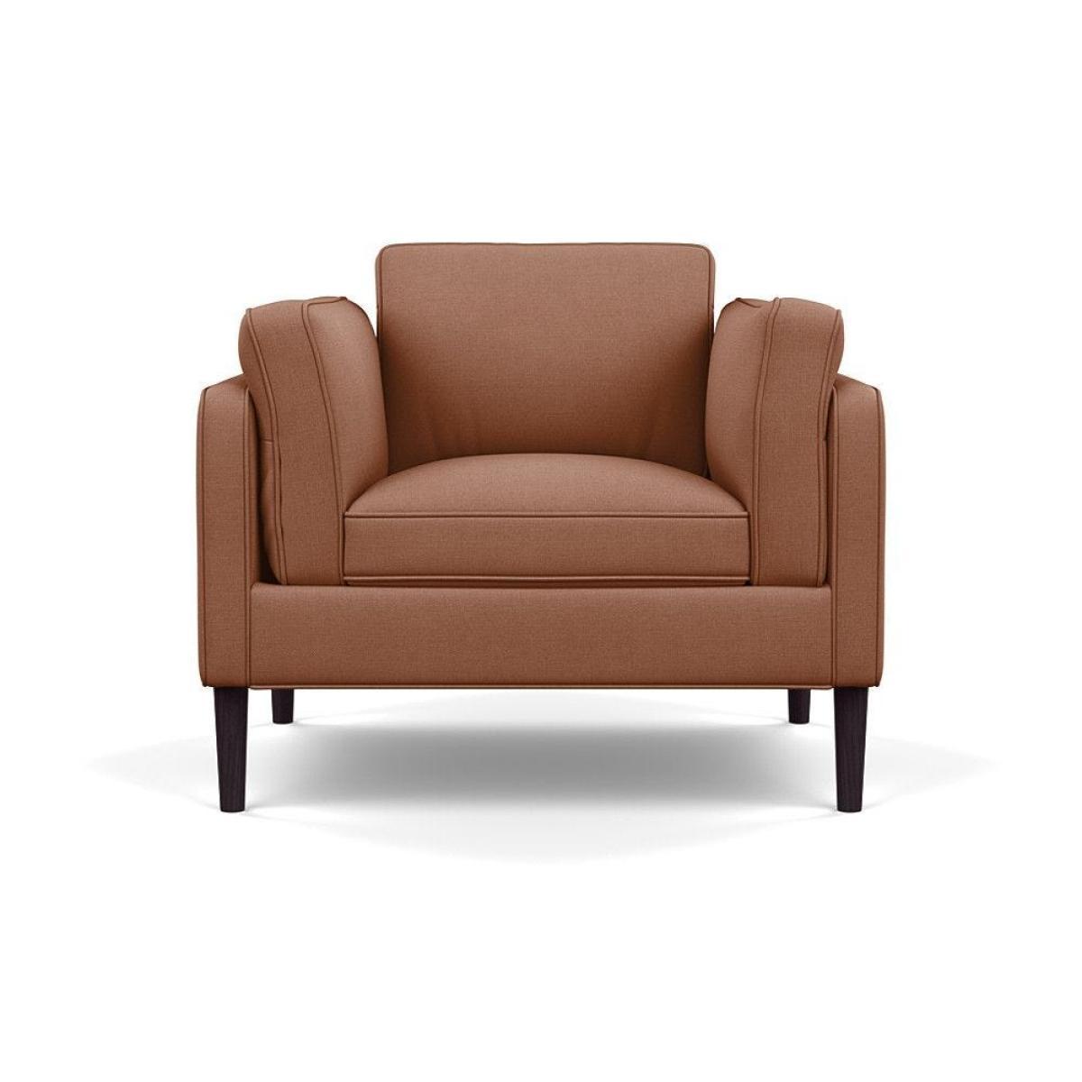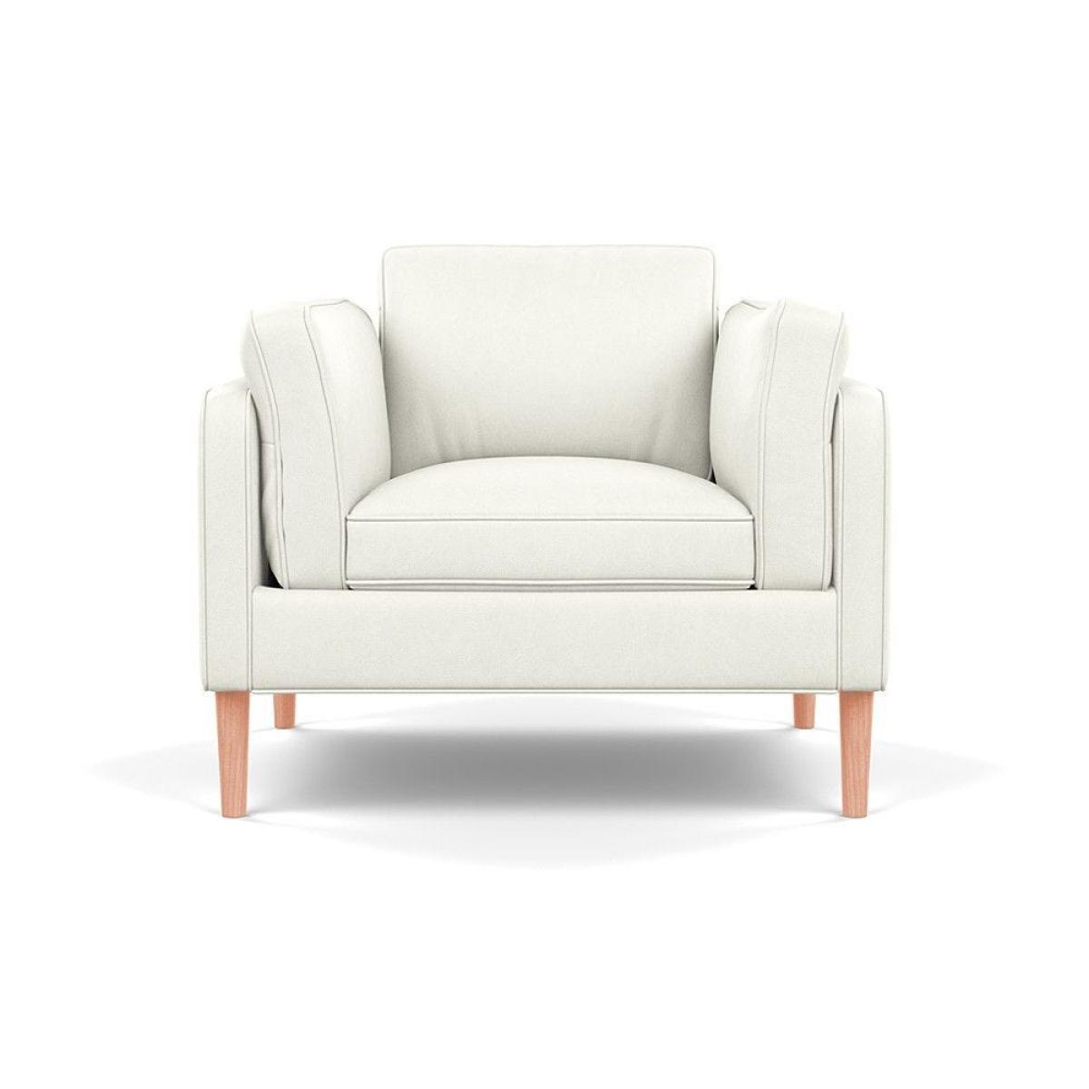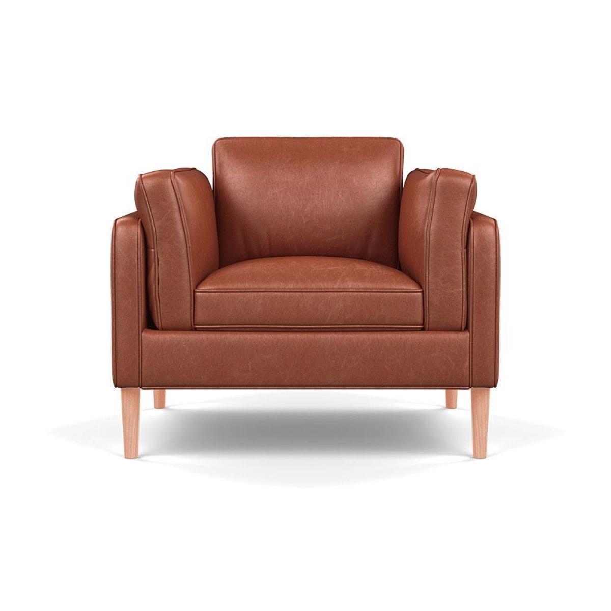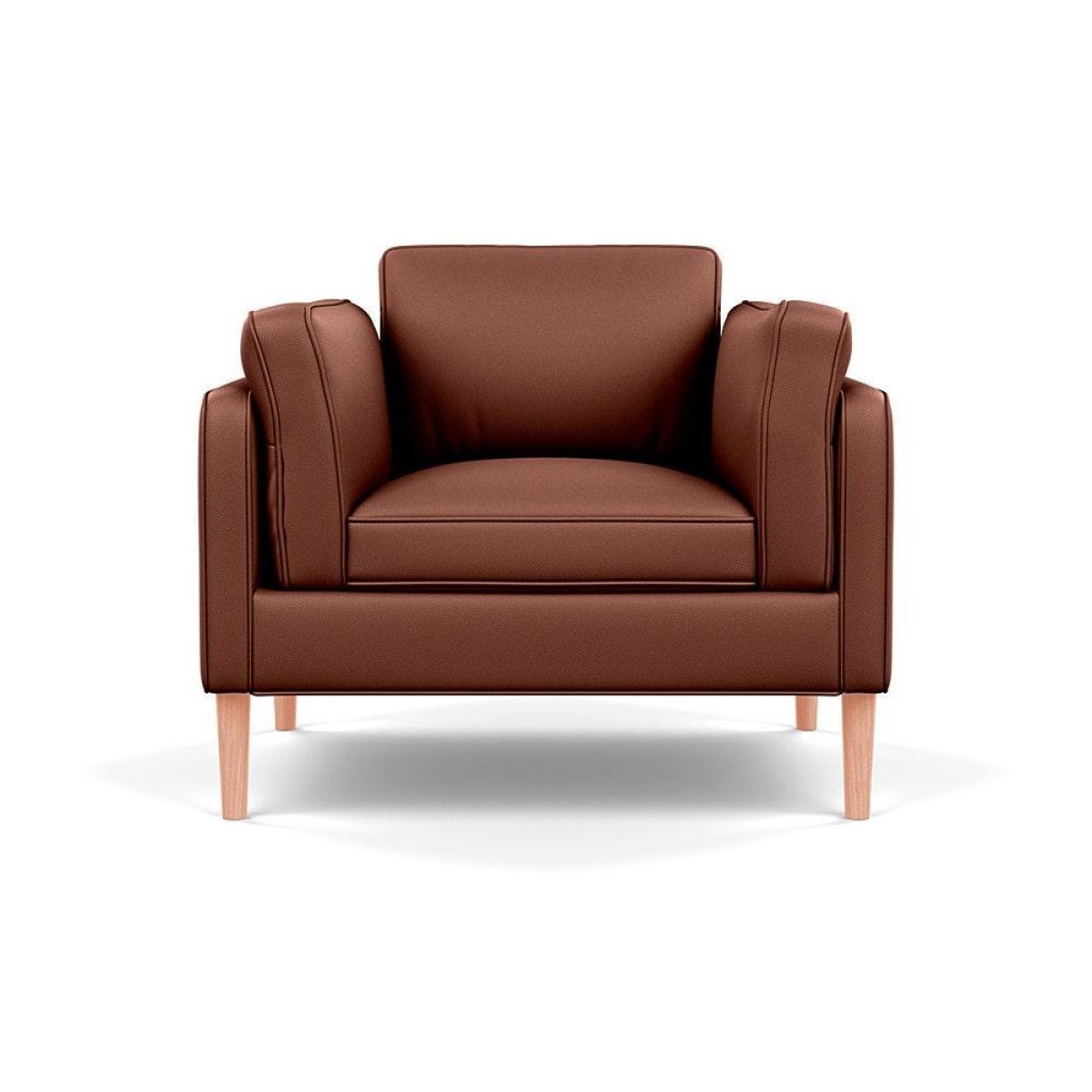 I’d call it the Sonno armchair - its lightly textured brown leather and dark-wood legs give it a clean, modern-mid-century look that works in everything from a pared-back Scandi living room to an urban loft. Practical and hardwearing, it’s easy to wipe down yet still feels warm, so it’s ideal by a reading lamp or as an occasional chair in a home office. To style, add a single woollen throw in slate grey or olive, place it beside a slimline metal-framed coffee table, and top with a low, woven cushion for a touch of contrast.