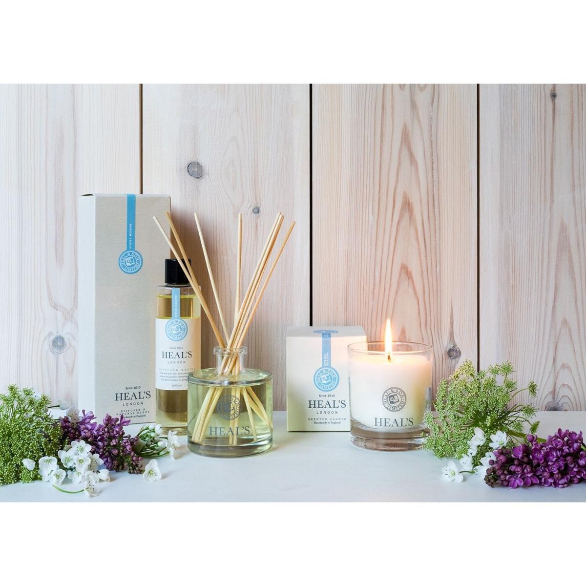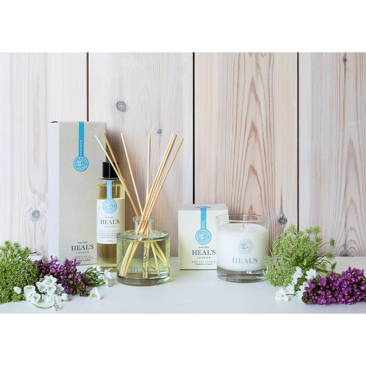 Immerse yourself in the comfort of a meadow in spring bloom. Green leaf and citrus notes meet hints of jasmine and gardenia. Traditionally made using the finest natural ingredients, each candle is made from 100% mineral wax and displayed within a glass holder with printed Heal's insignia.