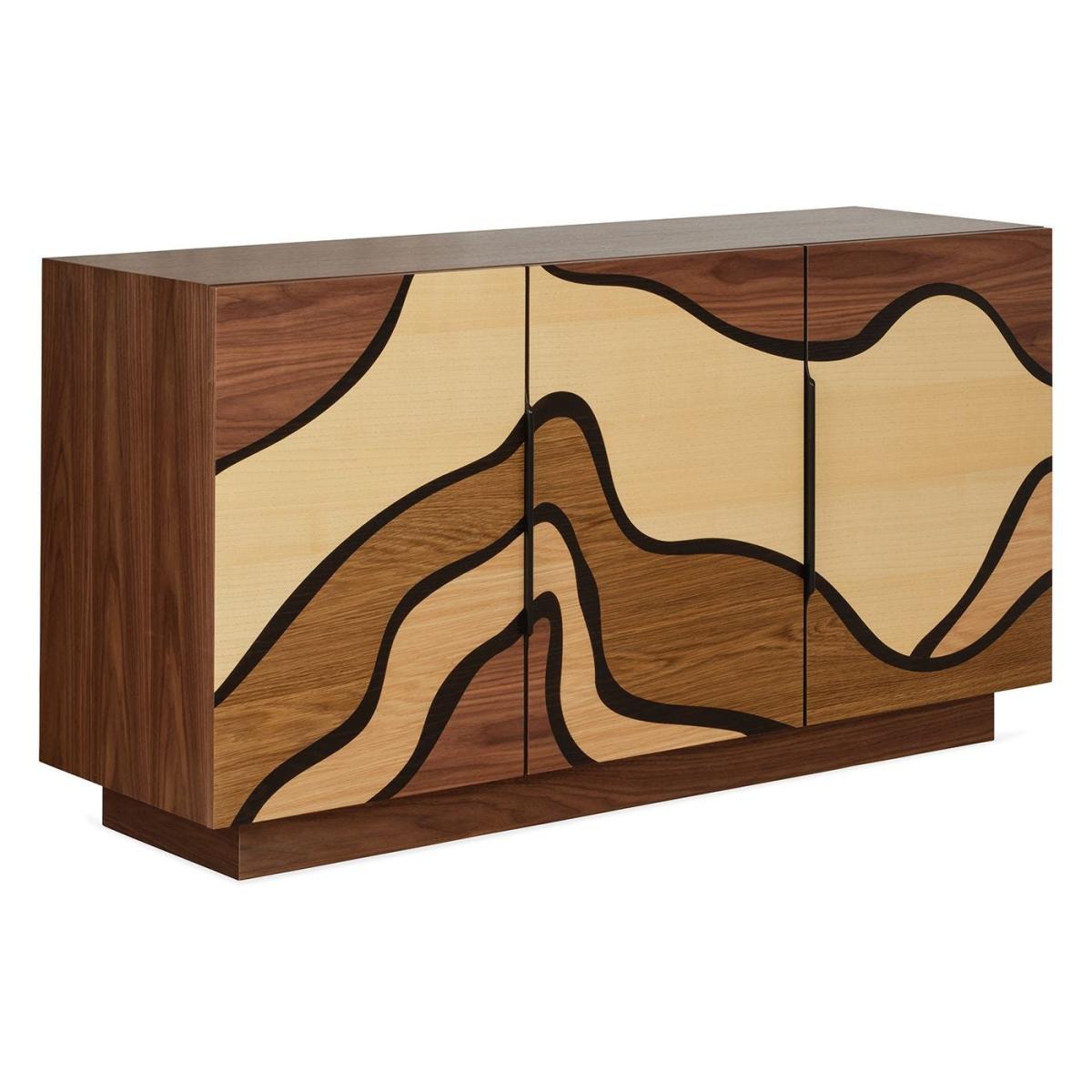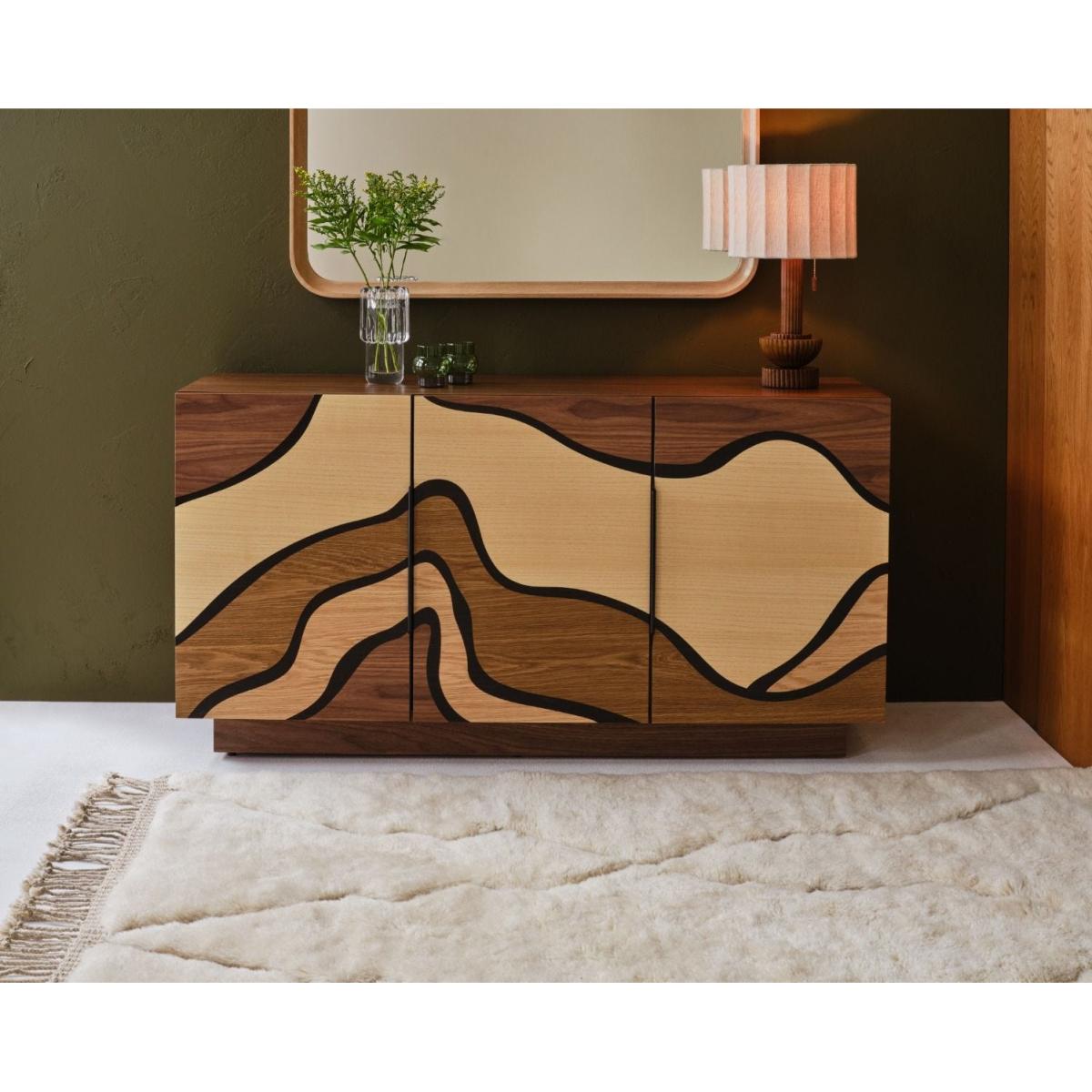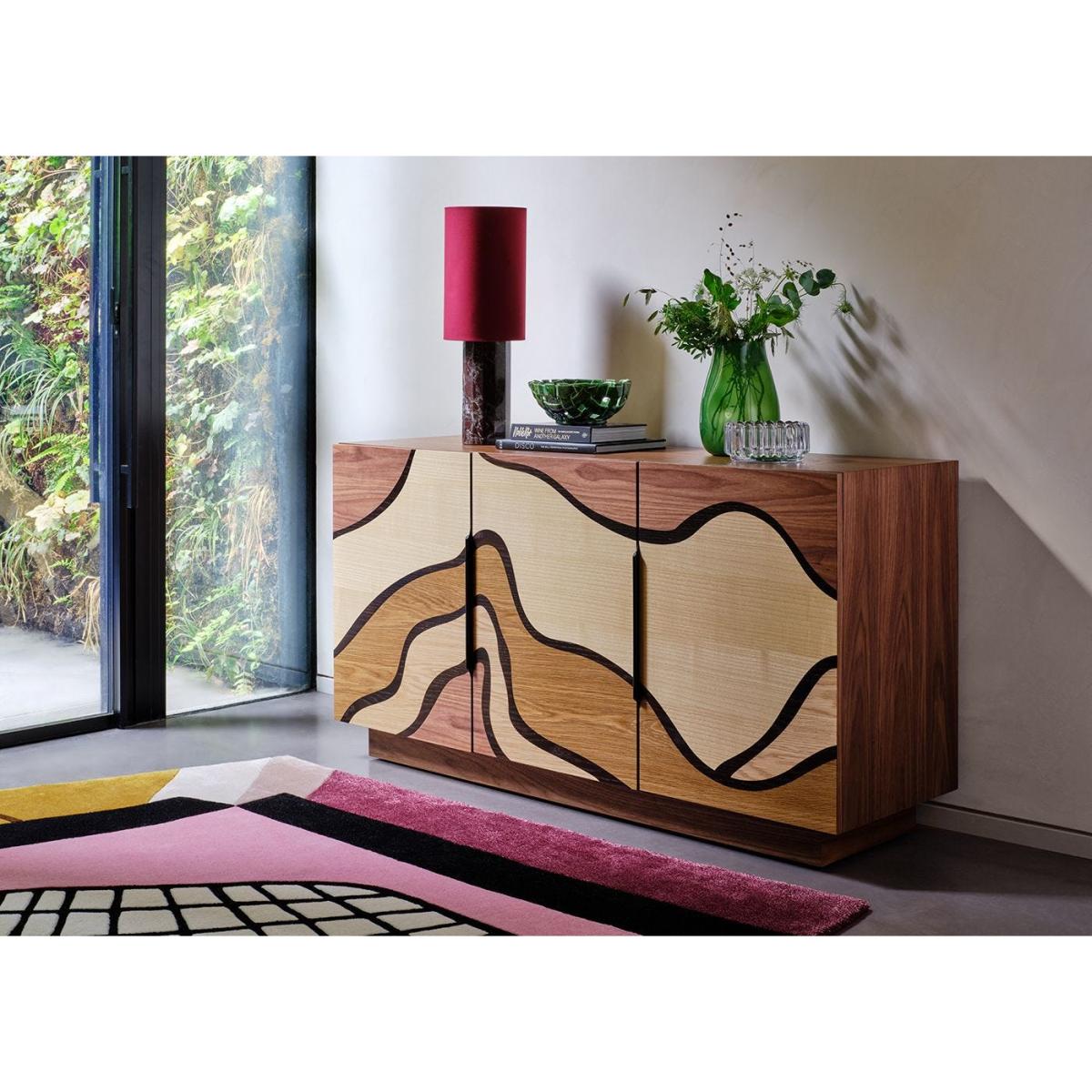 I love this sideboard for its bold, artistic pattern that adds a statement element to any room. It works particularly well in contemporary or eclectic interiors where a touch of personality is welcome, but it can also smarten up a more minimalist space thanks to its clean lines and striking design. Practical styling tips include pairing it with simple accessories or a few curated decorative items to avoid clutter, allowing the statement pattern to stand out. It’s ideal for living rooms, dining areas, or even hallways where its functional storage and visual impact can be appreciated. Keep surrounding furniture understated to let the piece sing, and consider neutral or warm-toned lighting to highlight its beautiful woodgrain and contrasting inlay.