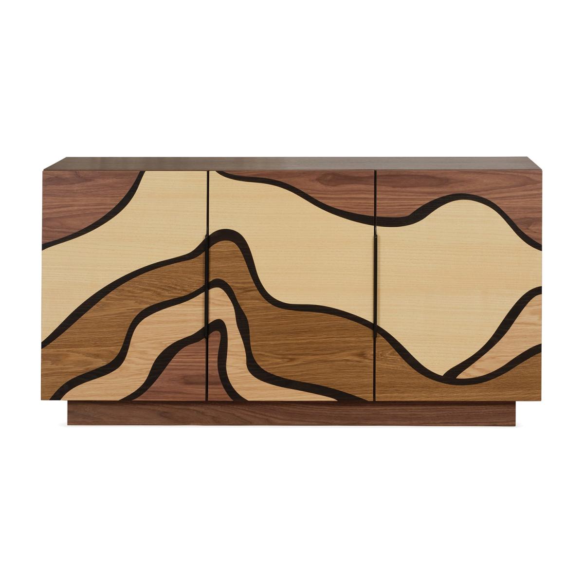 The striking Tidal Sideboard makes a dramatic statement with its distinctive laser-cut design, showcasing the beauty of its natural materials. A light oak interior contrasts with the exterior, comprised of ash and smoked oak, with inlays of walnut, combining to create a sculptural motif that evokes a bold sense of movement. With sleek powder-coated handles, soft-close doors, and adjustable internal shelves, the Tidal is a contemporary yet practical storage solution for any modern home.