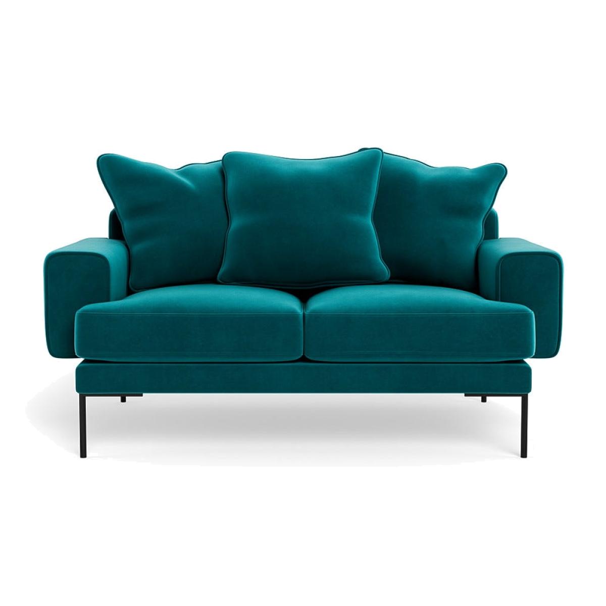 I’d call this the Torrington two-seater, and what really sells it for me is that rich petrol-velvet seat paired with slim black legs - it feels both luxe and pared-back. It sits equally well in a modern townhouse living room or a cosy, contemporary flat, and its compact proportions make it ideal for smaller spaces without sacrificing comfort. To style, layer in cushions in natural linens or boucle for textural contrast, and introduce metallic accents - think a slim brass lamp or side table - to pick up on the velvet’s subtle sheen. A light-toned rug beneath will lift the whole look, while a sculptural floor plant keeps things fresh and balanced.