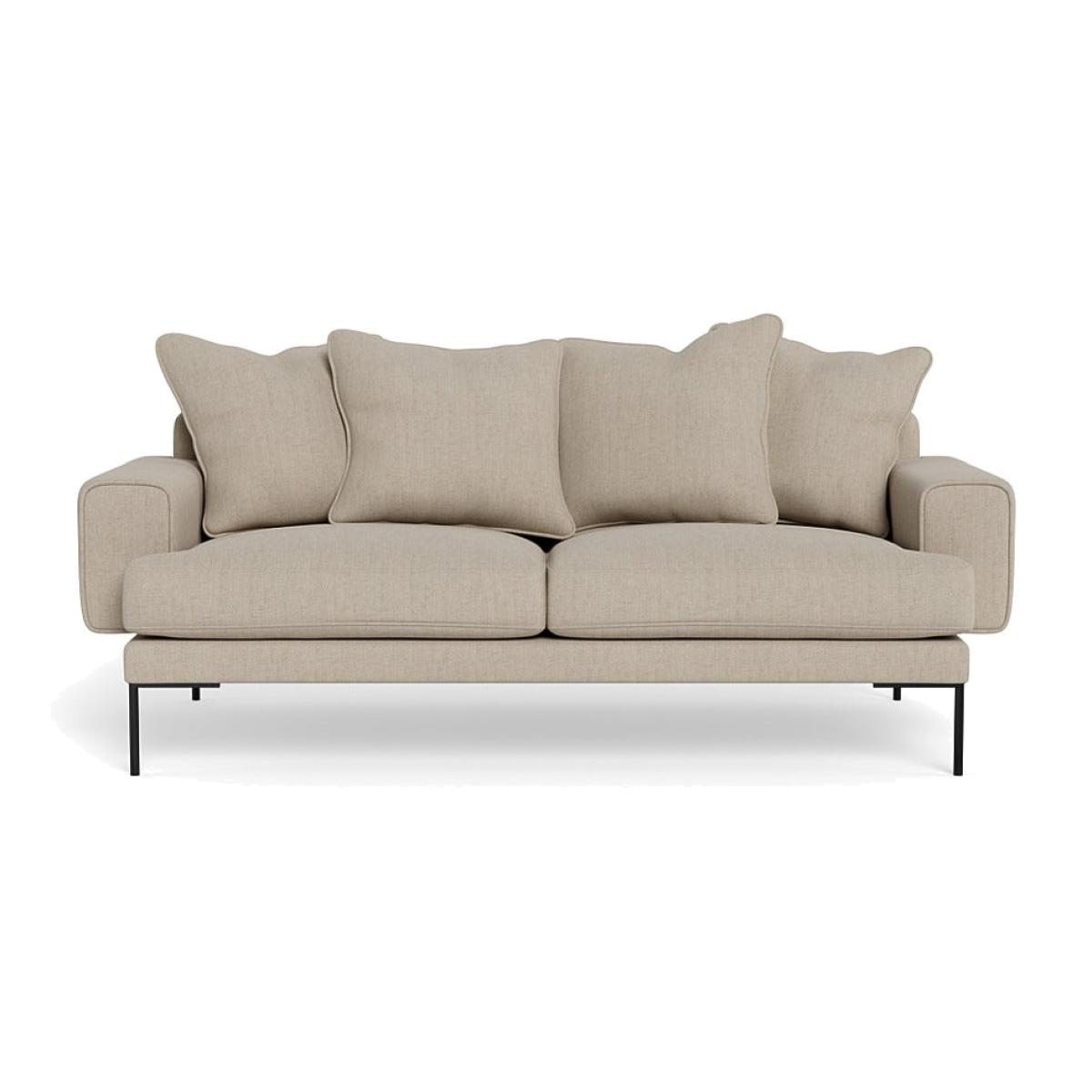 I’d describe this as the Torrington sofa - its clean lines and putty-coloured broad weave make it an incredibly versatile piece. I love how the slim black metal feet give it a light, contemporary feel, while the generously padded seats and scatter cushions ensure it remains comfortable rather than purely decorative. It works equally well in a minimalist Scandi scheme or a softer, neutral living room with natural woods and woven textures. To style it, try pairing with a chunky wool throw in a contrasting shade and a mix of patterned cushions in muted tones. Flank it with a low-profile side table and a sculptural lamp to keep the look balanced and uncluttered.