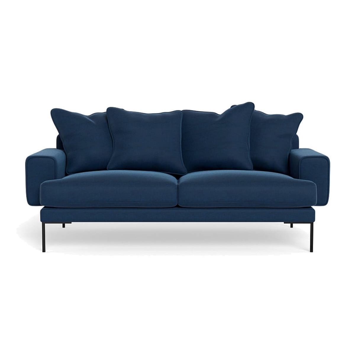 I often recommend the Torrington three-seater for its clean lines and practical linen-cotton upholstery in that deep inkspot tone. The slim black metal feet give it a modern, almost floating look, so it sits well in Scandi-inspired spaces or contemporary city flats where you want a bold focal point without heaviness. Styling tips: soften the silhouette with a chunky cream throw draped over one arm and introduce a couple of patterned cushions in muted greens or ochres for contrast. Pair with a pale oak coffee table and a low-pile jute rug to balance the dark seat, and leave plenty of floor space around it to show off those sleek legs.