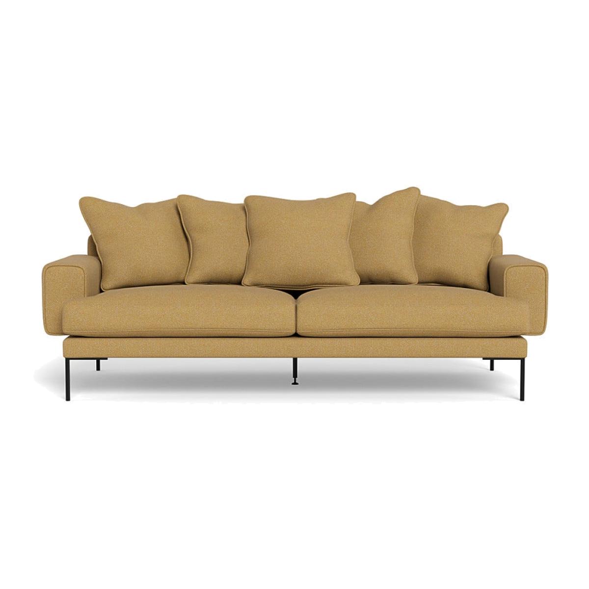 I’d refer to it simply as the Torrington sofa. I love its citrine bouclé tweed for injecting a warm, textured focal point without overpowering a room, and the slim black metal feet give it a light, modern lift. It sits perfectly in contemporary Scandi schemes or as a fresh counterpoint in industrial-inspired lofts. Keep styling straightforward: layer in a couple of cushions in soft, muted greens or terracotta to complement the yellow-ochre hue, and drape a neutral wool throw casually over one arm. A round oak coffee table and a low-pile jute rug will balance the sofa’s linear frame and keep the look relaxed yet refined.
