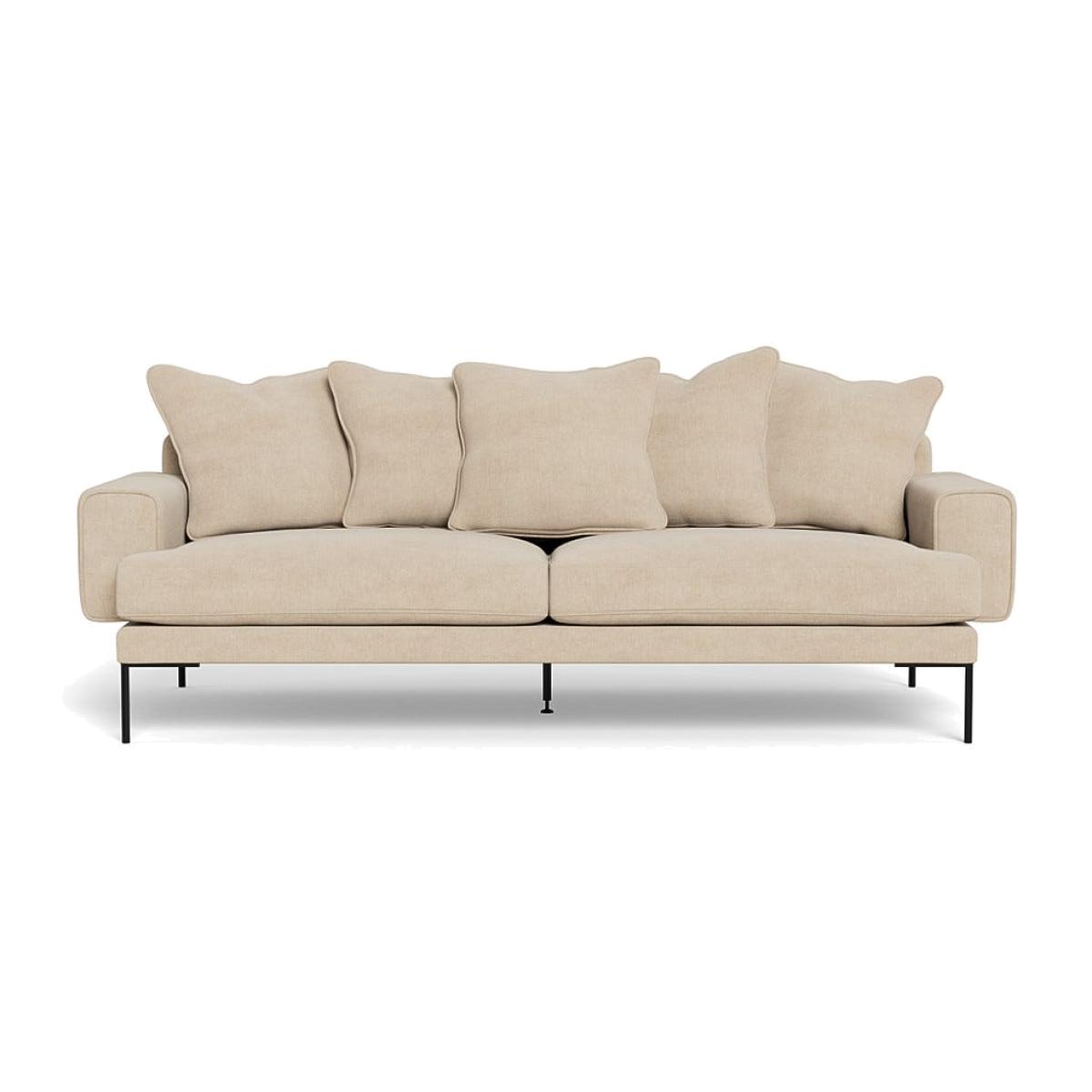 I’m a big fan of the Torrington sofa in oat - its brushed-cotton upholstery feels both durable and soft, while the slim black legs give it a light, contemporary silhouette that works equally well in Scandi-inspired or pared-back modern living rooms. For a cohesive look, layer in a textured wool throw and a mix of cushions in muted terracotta or deep charcoal; keep your coffee table low-profile so the generous seat depth remains visible, and balance the black metal feet with a matching floor lamp or side-table legs. The neutral tone makes it easy to switch up accent colours over time, so you can refresh your scheme without changing the main piece.