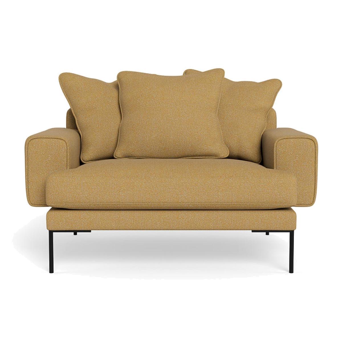 I really like this loveseat for its versatile style and inviting comfort. The boucle tweed in citrine offers a subtle texture that adds visual interest without overpowering a space, making it ideal for both contemporary and more traditional interiors. Its neat proportions and black feet give it a sleek, modern feel, while the warm colour can brighten up a minimalist scheme or complement earthy tones in a cosy lounge. When styling around it, consider pairing with neutral cushions and layered throws to enhance its texture or add contrasting colours to create a focal point. It's equally suitable for small living areas or as a statement piece in larger rooms, providing both style and practicality in a compact form.
