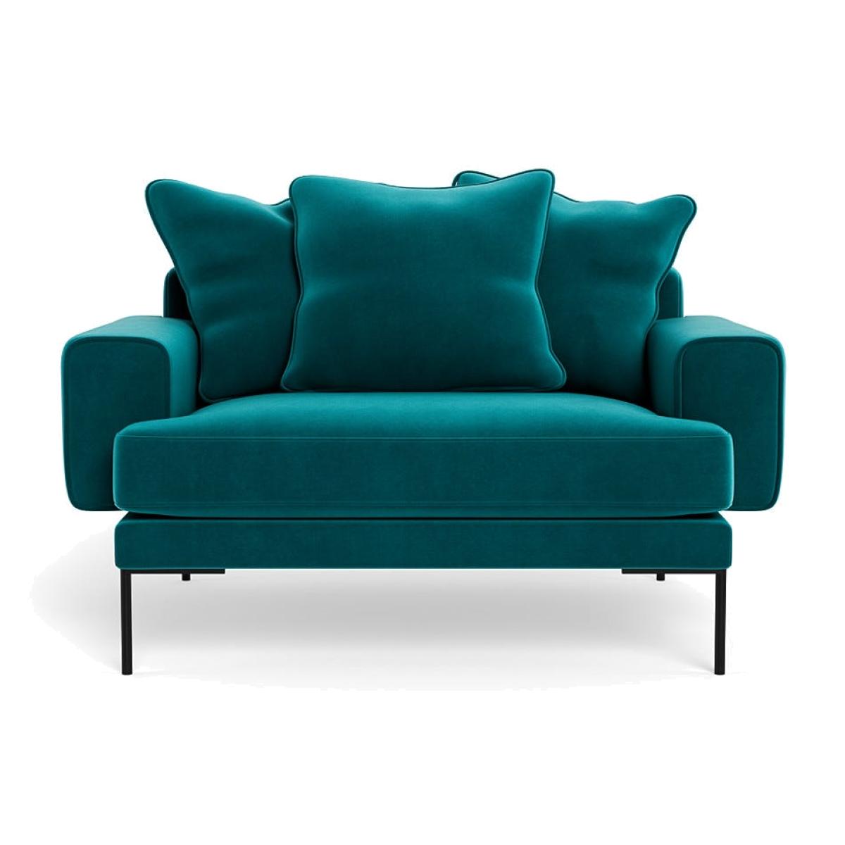 I love this loveseat for its rich petrol velvet finish and sleek black feet, which give it a modern yet sophisticated look. It's a versatile piece that works particularly well in contemporary or eclectic interiors, adding a pop of colour without overwhelming the space. Practical styling tips include pairing it with minimalistic, neutral-toned accessories to highlight its colour or opting for patterned cushions and throws to add layers of texture. Its compact size makes it ideal for smaller living rooms or as an accent piece in larger social spaces, offering both comfort and style with its plush seating and crisp silhouette.