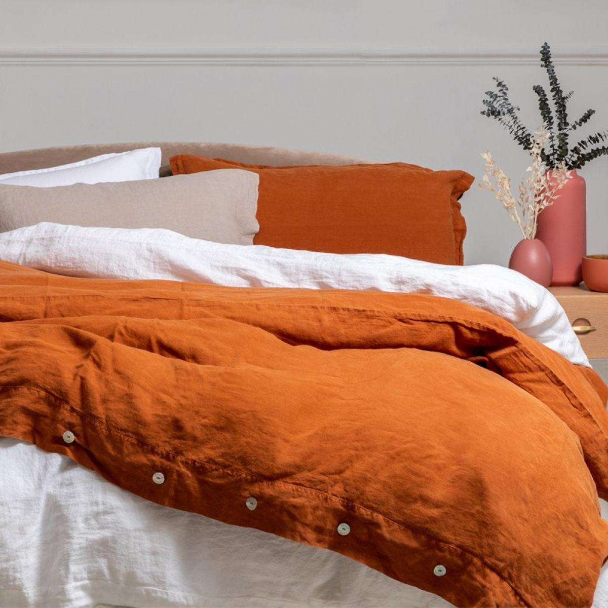 This exclusive Heal’s cinnamon linen bedding collection is washed to give a soft feel and relaxed look. It’s woven in Portugal using flax from the French region of Normandy in a sustainable process that requires less dyes and water compared to cotton. It’s noticeably weightier than traditional linen bedding, making it perfect for use all year round. Featuring mussel shell buttons on the duvet cover, this stylish set will complement any bedroom.