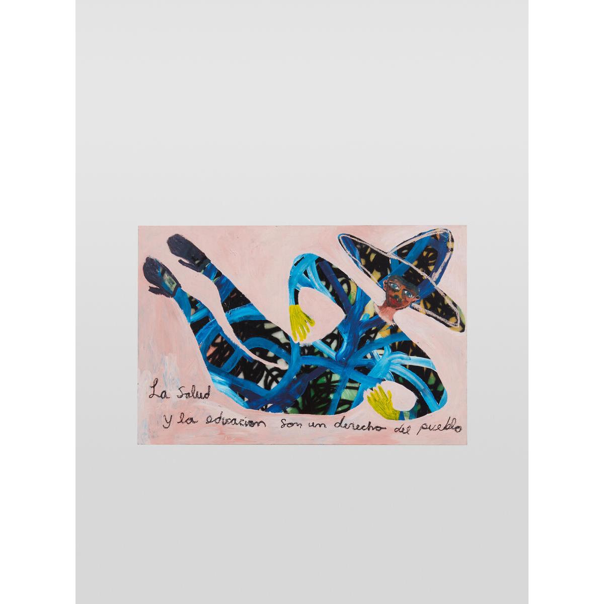 Born in El Salvador and based in Margate, UK, Jose Campos of. Studio Lenca focuses on the themes of identity, belonging, andoppression. After fleeing El Paz during its violent civil war inthe late 1980s, Campos travelled to the US by land with his mother. As a queer minority in San Francisco, he was deemed an'undocumented illegal alien', and uprooted to find refuge in theU K. 'As a queer member of the Latinx diaspora, my work is focused onideas surrounding difference, knowledge, and visibility. It oftenstarts through personal memories, creative activism or underpinnedby different forms of praxis, through performance, video, painting,and sculpture,' he says. 'Health and Education Belongs To The Village' by Studio. Lenca. Oil, spray paint and acrylic. Exclusive piece. From the M. A. H Gallery collection.