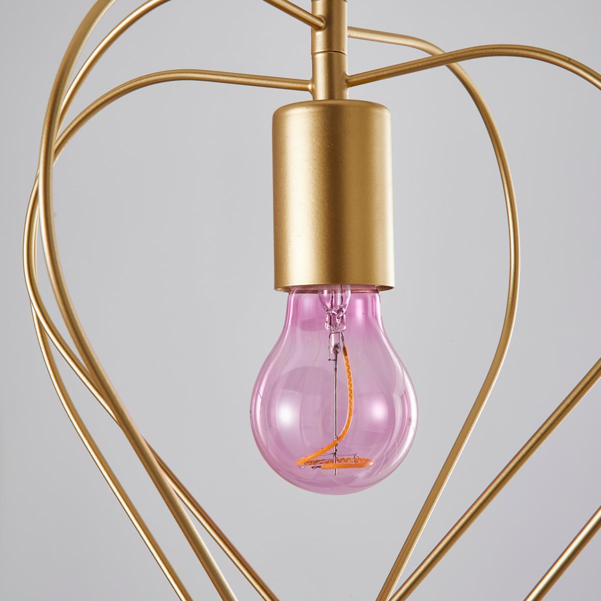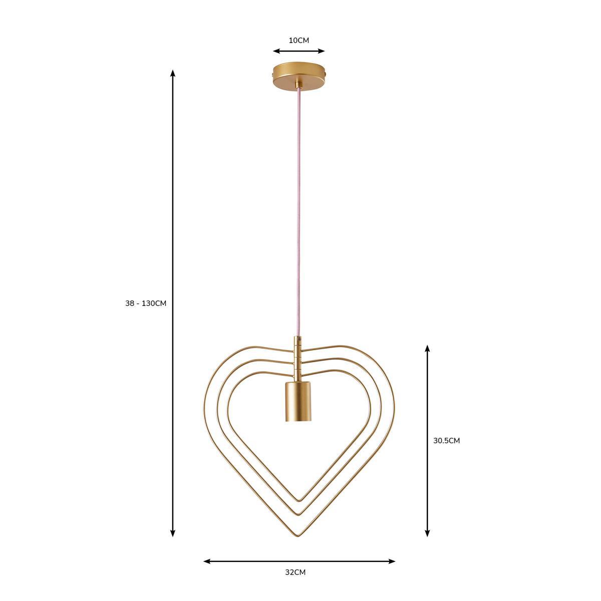 Add a fun and feminine touch to your little ones room with this stunning Heart 1 Light Pendant Ceiling fitting. Beautifully finished with a satin gold effect base and a 3D adjustable heart shape design. This pendant ceiling fitting is complete with a height adjustable pink cable and is dimmable compatible with a suitable bulb and switch.