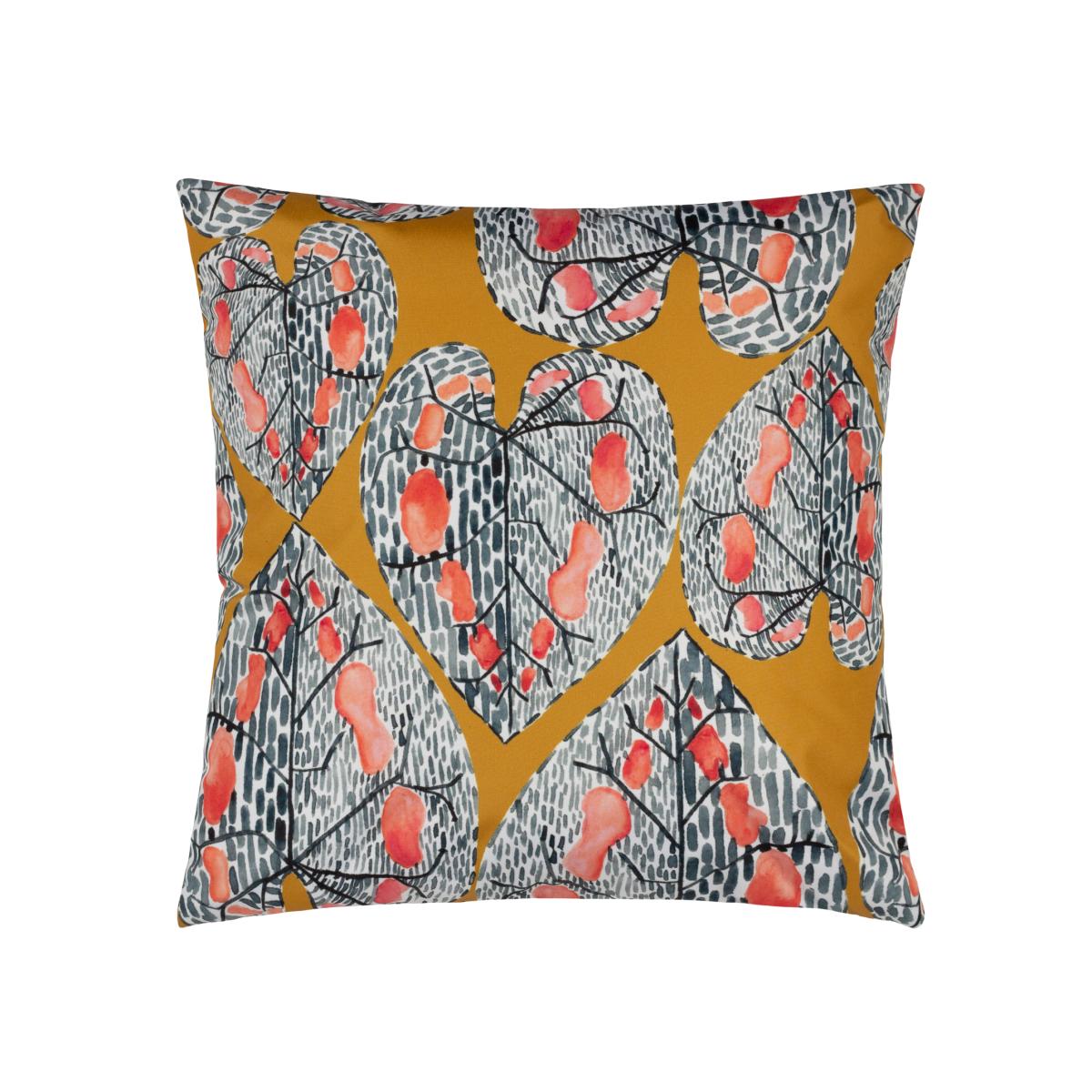 Featuring grey monochrome printed heart-shaped leaves with vibrant flashes of red around the veins, set against a bold saffron background. You will love the Mahari outdoor cushion, with its heart-shaped jungle leaves! Set on a bold saffron background, this abstract tropical design is printed on UV and water-resistant Polyester, adorned with vibrant flashes of red surrounding the veins. A great way of adding both colour and personality to your outdoor space. Heart Leaves Outdoor Cushion - Saffron