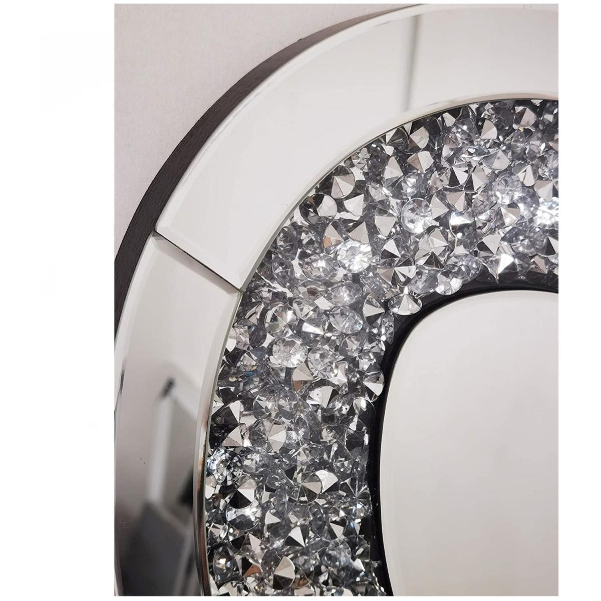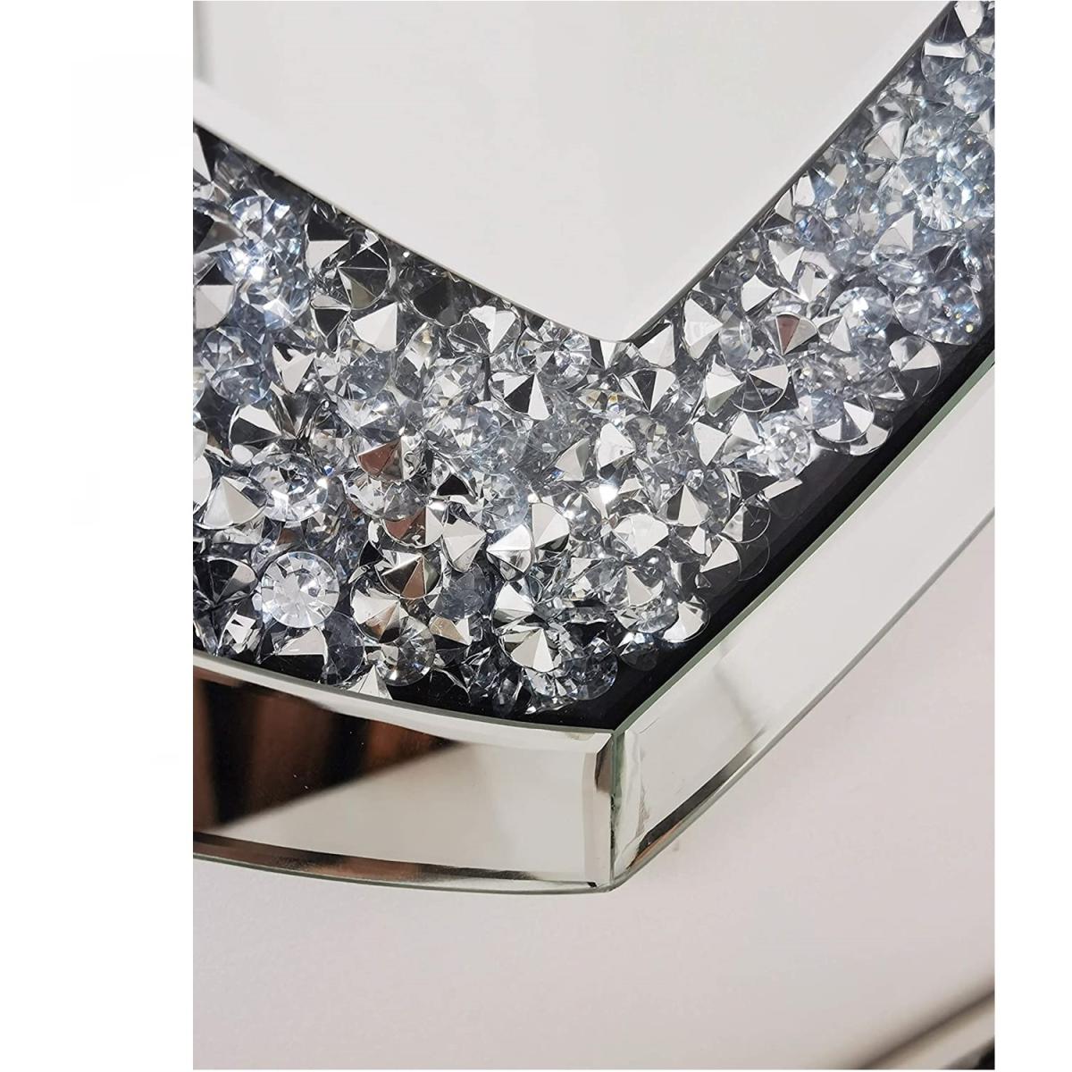 Heart shape wall mirror. Crushed acrylic diamond crystal frame. Backing and side finished with black felt giving a modern look. Hook at back for wall hanging.
