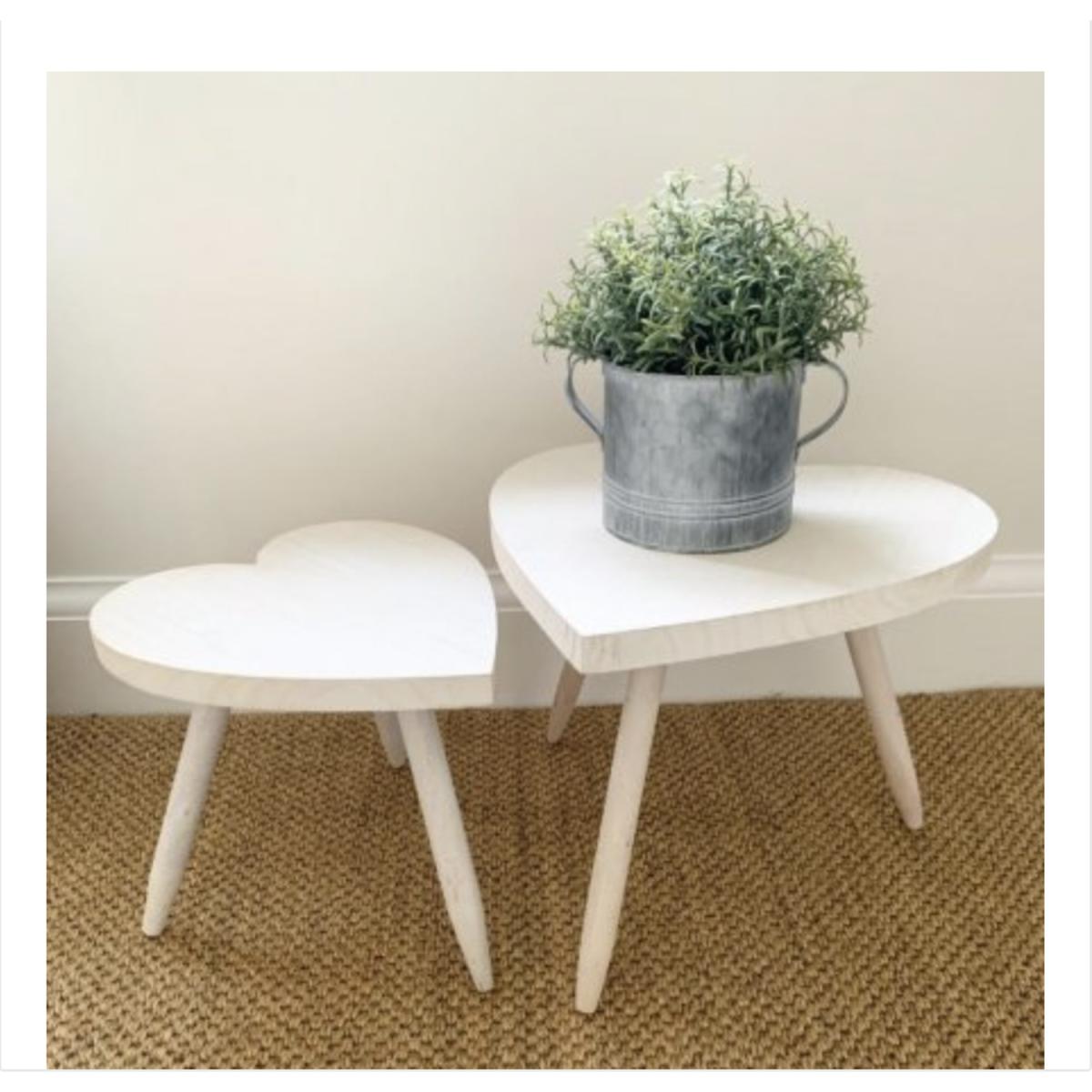 Heart Table Whitewash Finish, Please note the photos contain 2 sizes of side tables. This listing is for 40cm only. A large sized heart-shaped side table complete with a smooth natural wooden feature. Perfect for extra seating for little ones or a decorative side table in any space. A gorgeously simple accent to bring to any themed home interior.