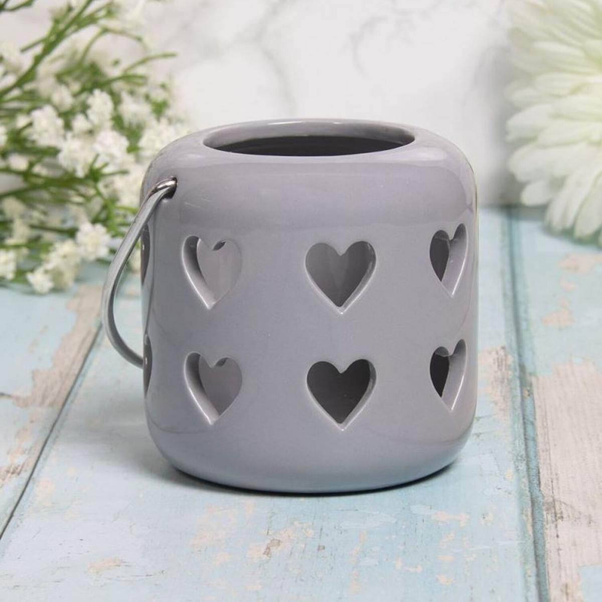 Ceramic hearts tealight candle holder. Cut out heart design. Includes silver colour handle. Available in White, grey or pink. Use in the home, events or as part of a table decoration.