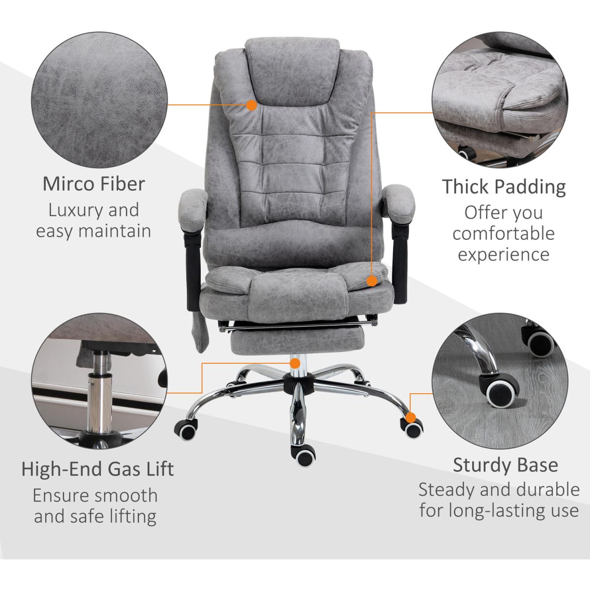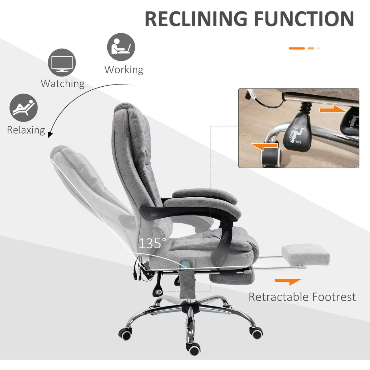 Work and relax, all-in-one, with this Vinsetto massage office chair. Wrapped in smooth and stylish microfibre upholstery, this computer chair is great to sit on and look at! But, most importantly, it has six heated massage points - four on the back, two on the seat: simply turn on the remote and relax. The seat gives wide sitting room, a high back and arms for support. With a 135 degrees reclining backrest, finished with a manual footrest to elevate your lower body with ease.