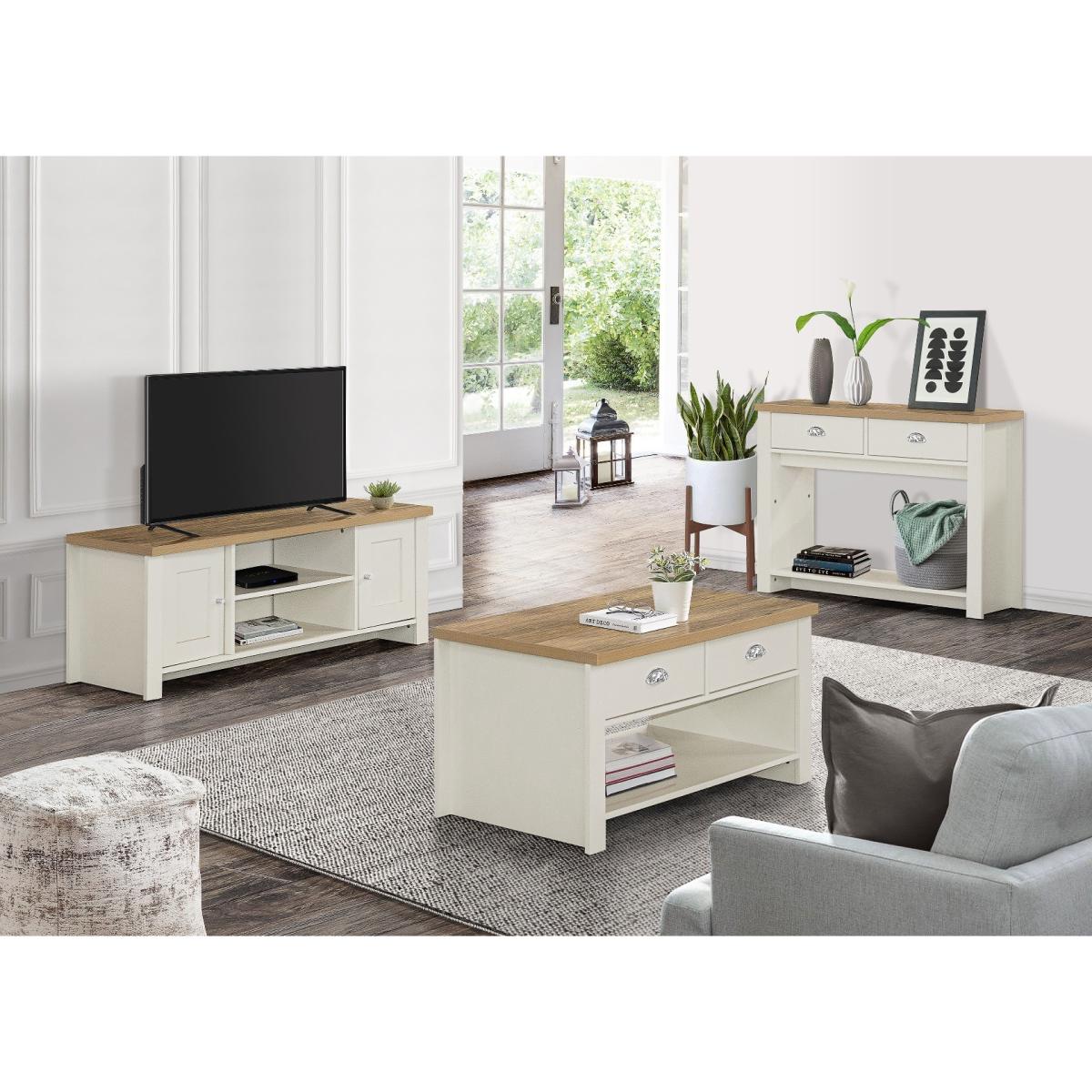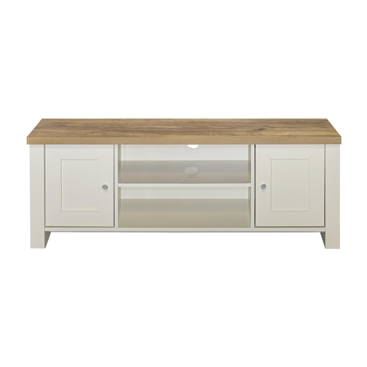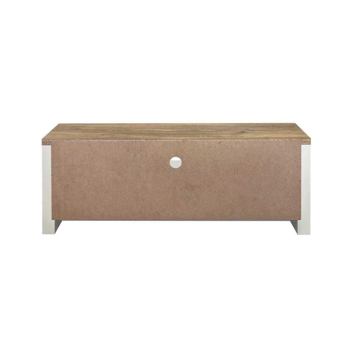 Enjoy the pure charm of the Heath collection. Inspired by a traditional farmhouse look, these pieces combine oak and colour for a pleasing effect, suiting a modern flat equally as well as a cosy cottage. This versatile unit supports a 58” TV (max) and features an open shelf for consoles plus two spacious cupboards for DVDs and games. High-quality craftsmanship Durable laminate with satin silver cup handles. A stunning oak-effect top Choose from white & oak, grey & oak or navy blue & oak. Easy self-assembly