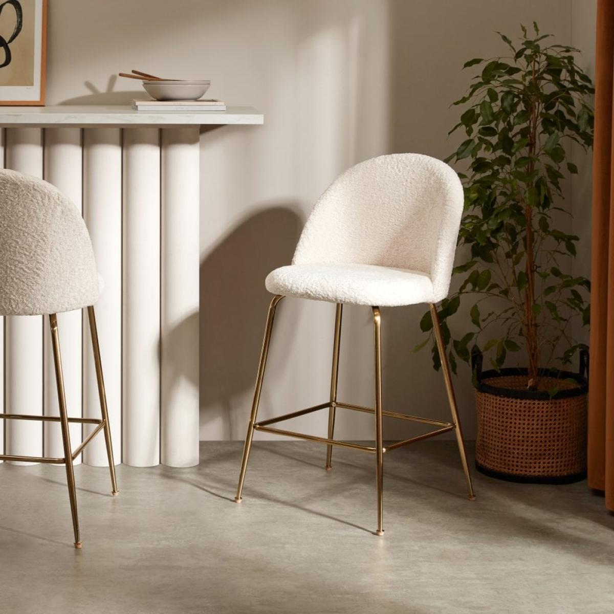 Upholstered in boucle, the Heather ivory white bar stool introduces a Scandi approach to lounge furniture. Featuring a curved back and quilted detailing that hugs the contours of the body, and finished with sleek metal legs - with a built-in footrest. View The Heather Range