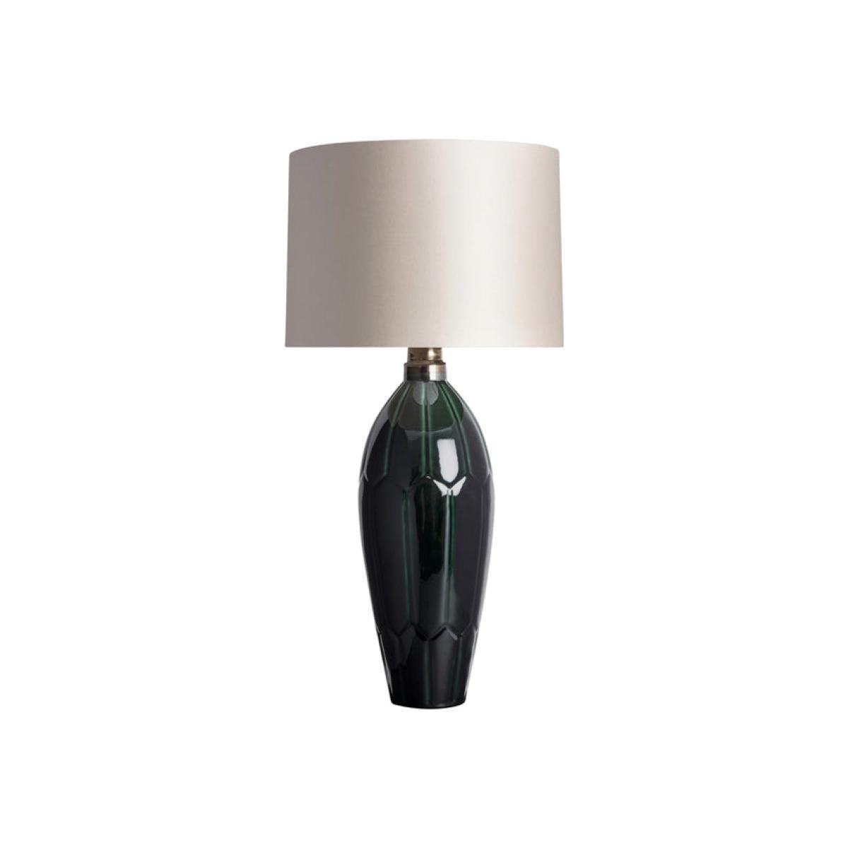 I love this table lamp for its sleek, modern silhouette and versatile colourway, making it a great addition to both contemporary and transitional interiors. Its glazed ceramic base adds a touch of sophistication, while the neutral lampshade ensures it blends seamlessly into various schemes-think side tables in living rooms or bedside tables in bedrooms. For styling tips, consider pairing it with textured cushions or artwork that pick up on the deep green tone of the base, or group it with other metallic accents for a curated look. It’s practical too, offering good task lighting with an elegant presence, perfect for lifting simpler spaces and adding a touch of polish.