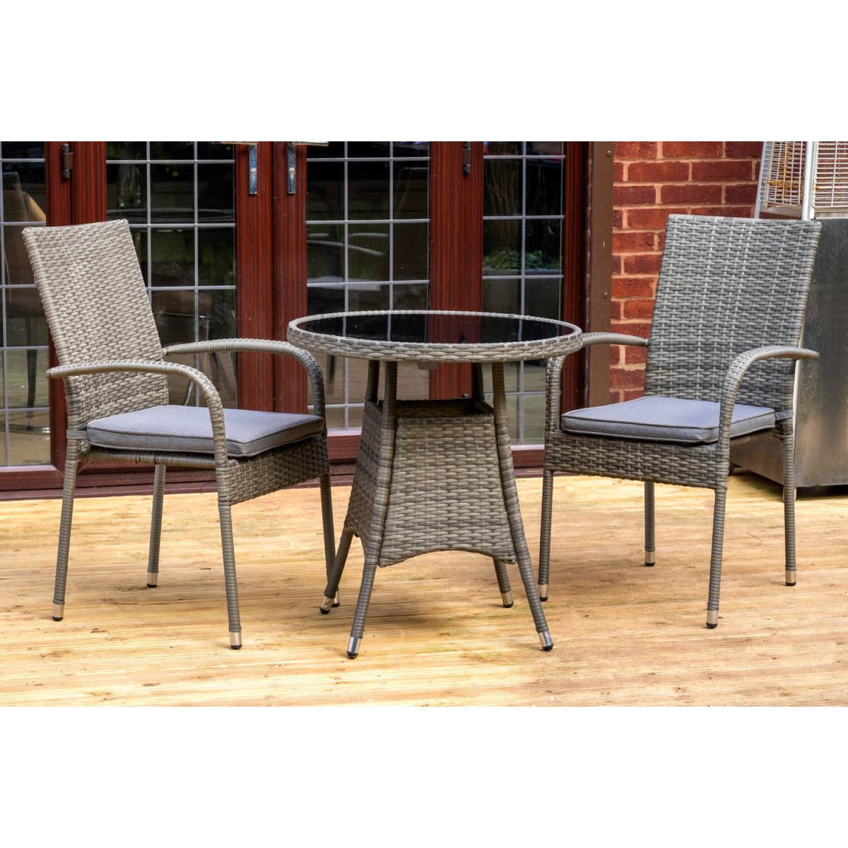 Transform your garden or conservatory this summer with the Signature Homes and Gardens Heaton Grey Rattan Bistro Set. Combining high-quality grey rattan with a powder-coated steel frame, this set is designed for both durability and style. It is the perfect solution for intimate outdoor dining, offering comfort and elegance. The set includes a rattan bistro table with a tempered glass top and two rattan arm chairs, each featuring grey seat pads for added comfort. The parasol hole makes it easy to add a parasol for shade, enhancing your outdoor dining experience. This set is easy to assemble, and its modern design makes it a beautiful addition to any outdoor space. With two colour variants available, you can select the one that best complements your style.