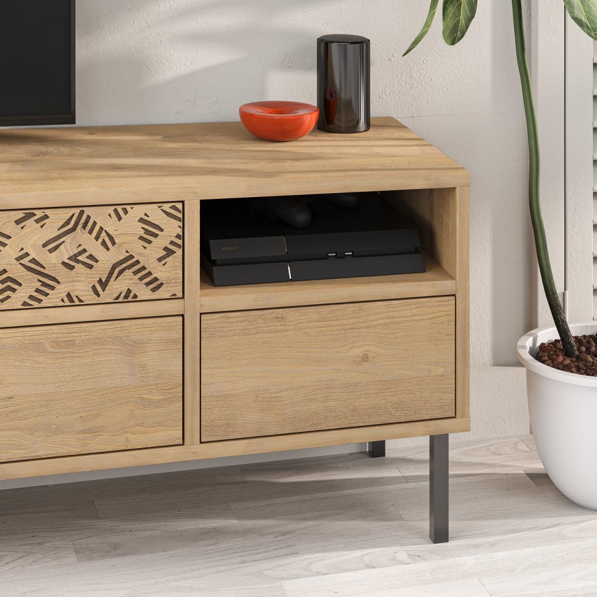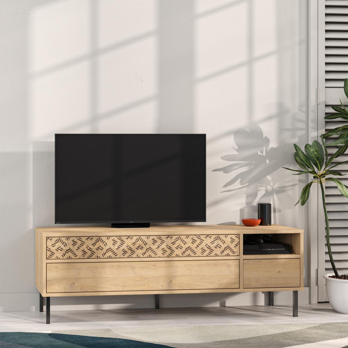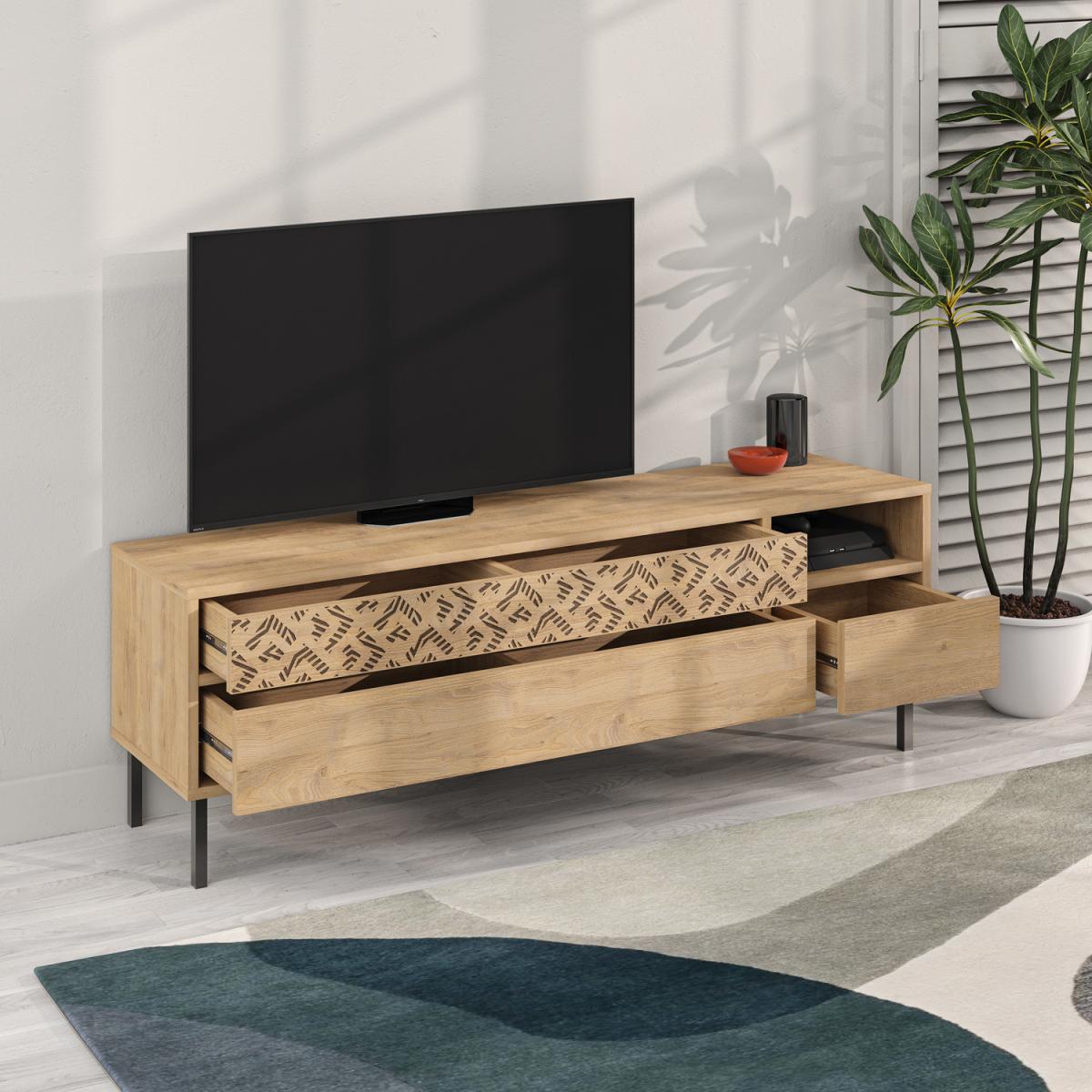 Introducing our stylish and functional TV stand, the perfect blend of style and function. The unique design features laser-cut details that add a touch of sophistication to your living room decor. The durable and supportive metal legs ensure stability and longevity. With three drawers and one open compartment, this TV stand provides ample storage space for your media and gaming accessories. Keep everything organized and within reach, maintaining a neat and clutter-free living room. The wood effect finish adds a warm and inviting feel to the stand, making it a versatile choice that complements any decor style. Measuring 145 cm in width, this TV stand is suitable for TVs up to 60 inches, offering the perfect fit for your entertainment needs. Additionally, it comes in a variety of color options, allowing you to choose the one that best suits your living room's aesthetic. The unique design and combination of wood effect make this TV stand a seamless fit for any home design, effortlessly matching your existing furniture. It serves as a versatile piece that can be used as an entertainment unit, console, display unit, living room storage, or sideboard, giving you flexibility and room for creativity. Assembly is easy and enjoyable with the included clear instructions. Our sturdy and recyclable packaging ensures secure delivery, giving you peace of mind. Maintenance and cleaning of this TV stand are hassle-free. Simply use a damp cloth, as no chemicals are needed to keep it looking great. Experience the exceptional design of our TV stand that flawlessly matches your current decor. Its ample storage space and unique details make it a focal point in your living room, while helping you keep your space organized. Choose our TV stand and elevate your living room with style and functionality.