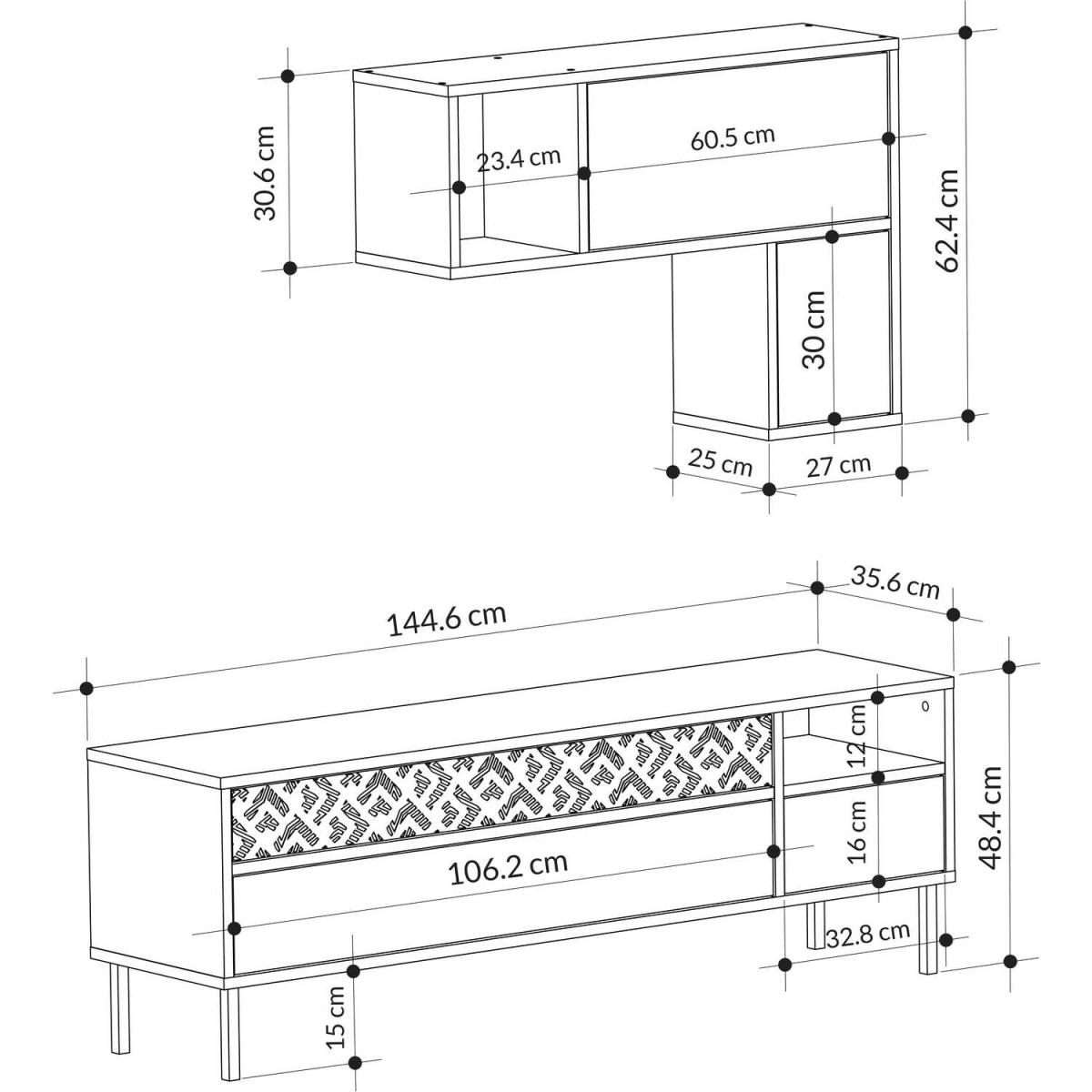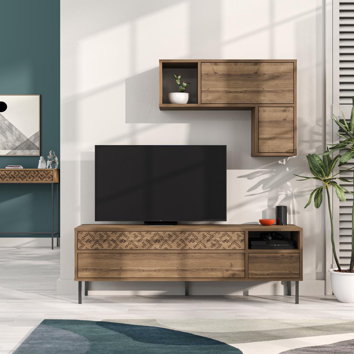Introducing our stylish and functional TV stand that combines style and functionality. It features laser-cut details for a sophisticated touch, and the metal legs provide durability and support. The stand offers ample storage space with 3 drawers, 1 open compartment, and a wall-mounted cabinet to keep your media and gaming accessories organized. The wood effect finish adds warmth and blends well with any decor style. With a width of 145 cm, it accommodates TVs up to 60 inches. Choose from various color options to match your living room furniture. This TV stand's unique design and wood effect make it a perfect fit for any home design. It will be the focal point of your living room while keeping it neat and tidy. Sturdy and recyclable packaging ensures secure delivery. Assembly is easy and enjoyable with clear instructions. The TV stand is created with high-quality engineered wood and features a protective melamine finish. It is easy to maintain and clean, just use a damp cloth without the need for any chemicals. With your creativity, it can be used as an entertainment unit, console, display unit, living room storage, or sideboard. The exceptional design of this TV stand will flawlessly match your current decor. It is suitable for TVs up to 60 inches with a width of 145 cm.