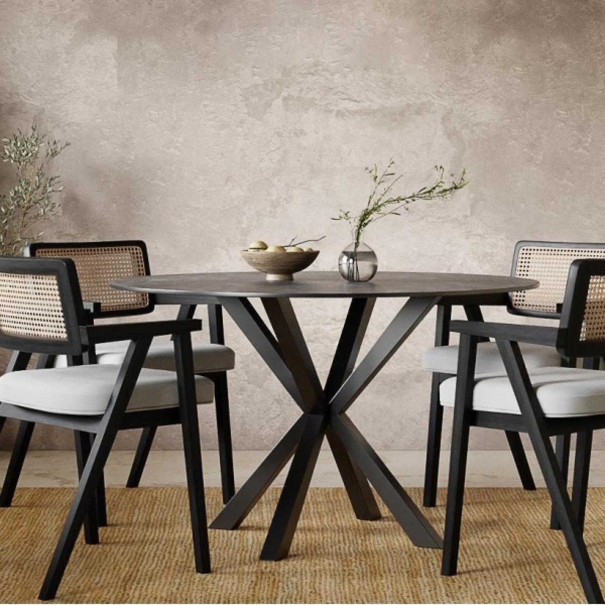This round dining table in grey ceramic is a versatile piece that works beautifully in both modern and contemporary interiors. I love its sleek, minimal design paired with the geometric base, which adds visual interest without overwhelming the space. It’s perfect for smaller dining rooms or open-plan areas, creating an inviting centrepiece for family meals or casual gatherings. For styling tips, consider pairing it with upholstered chairs in contrasting textures or colours to add warmth, and keep accessories minimal to highlight the table’s distinctive design. It’s a practical choice that balances style and functionality, making it a smart addition to almost any dining setup.