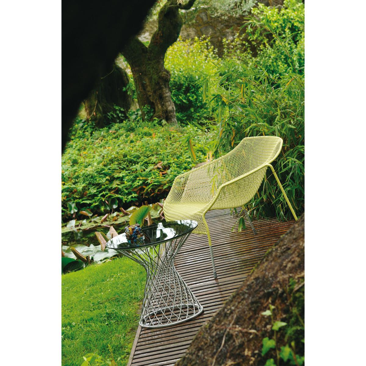 Emu company decided to reinterpret metal material and asked great designers for help. Genius Jean-Marie Massaud played along and designed the Heaven collection. Featuring enveloping forms and airy silhouette, this table represents, according to its designer, "a manifesto of elegance, mid way between glamour and timeless sensuality". Supplement, bedside or side table, it will fit into any home or garden environment. It is a real technological feat: this collection transforms steel – rigid and cold – into "plastic", soft and extensible material. The flexible material is plaited like a precious fabric and then shaped so that these supple and sinuous lines can be born. The combination of transparent smoked glass tabletop and (Ø 45 cm) and metallic intertwining gives volume to the ‘incorporeal’ table.