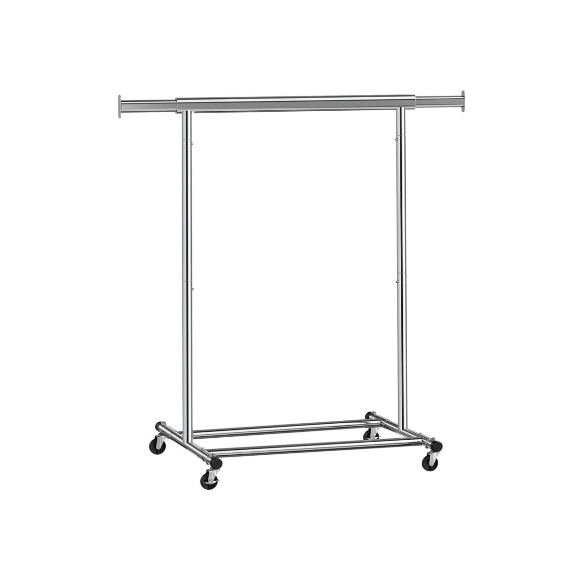 Constructed entirely from chrome-plated steel tubes with a flat top rail, this clothing rack can hold up to 90 kg (evenly distributed) without bending or shaking. The extendable hanging rod (92-132 cm) provides plenty of room for clothes, bags, and accessories, while the bottom shelf is ideal for boxes or storage bins. Fitted with four 360 swivel PP castors (two lockable), this garment rack moves smoothly even when fully loaded and stays securely in place when needed. Designed for quick and easy assembly - no nuts or bolts required - so you can have it ready to use in just one minute. The collapsible base allows for compact storage and easy transport when the rack is not in use.