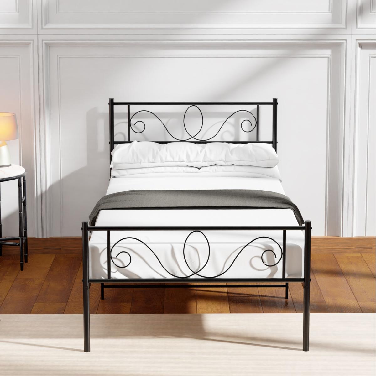 This sleek, black bed frame will introduce a touch of modern sophistication to your bedroom. Its unique scroll design imparts a sense of timeless elegance, offering both comfort and style. Experience enduring reliability with a steel frame and a powder-coated finish, providing resistance to wear and tear. Enjoy this bed frame for many years, as its durable construction ensures it withstands the test of time. Achieving a stylish bedroom look is effortless. It assembles quickly and easily, thanks to the straightforward instructions included, allowing you more time to relish your new space. Indulge in quality rest and relaxation with this spacious bed frame, perfect for a serene night's sleep. Its generous size allows for ample comfort and freedom of movement, making it ideal for curling up and enjoying a refreshing nap. You'll be pleased to discover that this bed frame's classic metal scroll design makes it suitable for almost any bedroom decor. Its versatility enables you to effortlessly change the look of your bedroom, quickly and with ease.
