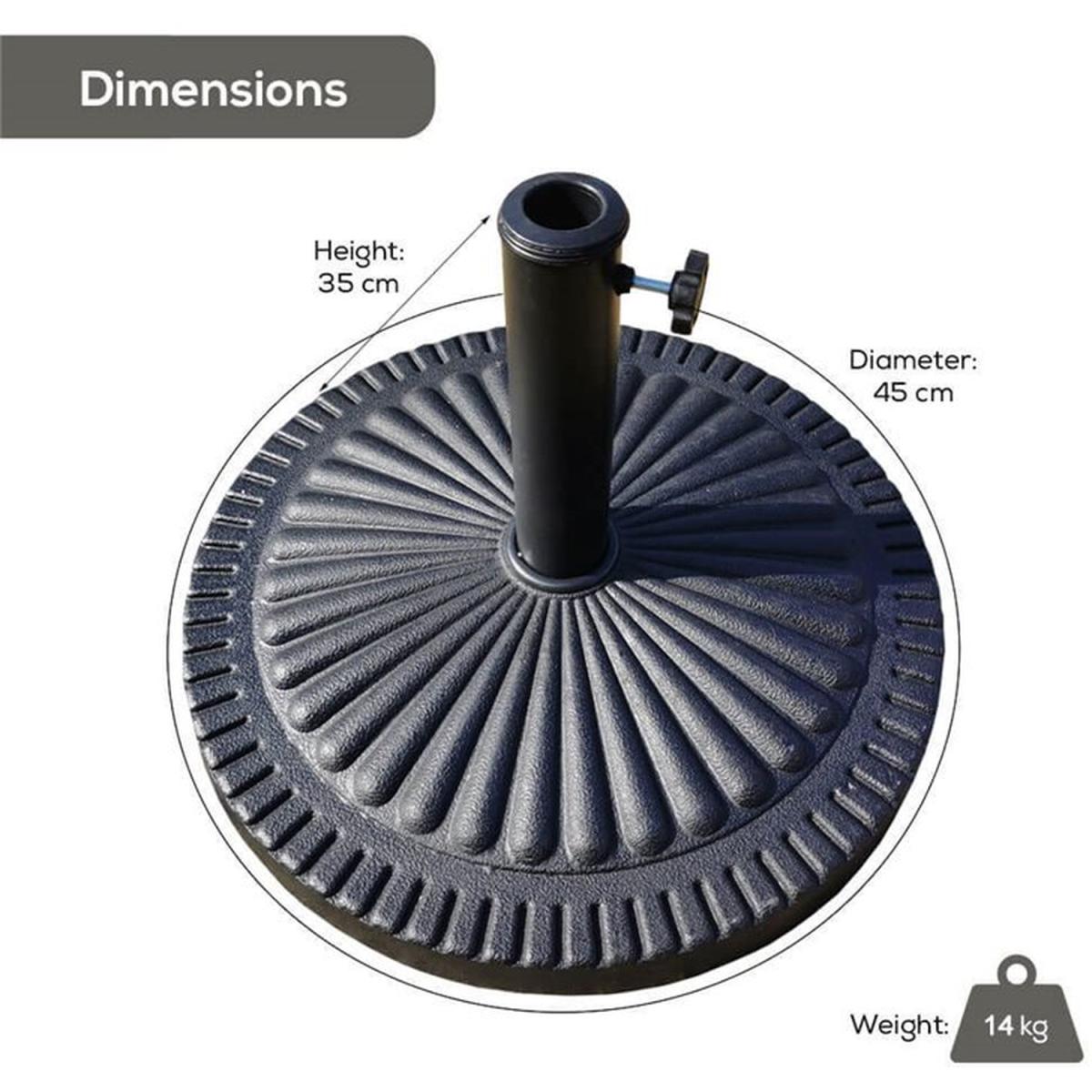 When you spend money on a garden parasol you always have to check that it comes with a base so it can be secured firmly in position. If not, you should look for a strong and sturdy parasol base that can be used to fix it into place. This garden parasol base weighs a heavy duty 14 kg, making it the perfect solution. The importance of having a strong parasol base in place shouldnt be overlooked, as it not only ensures you keep the right level of shade in the area, but it keeps the people underneath safer. Wind can pick up at any time and if an outdoor parasol does not have the correct fixing to hold it in place, it could topple and fall down. This garden umbrella stand is ideal for garden areas and patios, and is made from long-lasting, low maintenance poly resin. It could also be used to accommodate smaller pole diameters thanks to the adjustable screw thats included. The tube diameter is suitable for umbrella poles of 32 and 48mm.