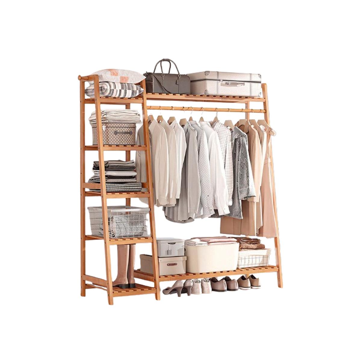 Maximize your storage with this stylish and functional bamboo garment rack. Perfect for organizing clothes, shoes, and accessories, it features a dedicated hanging zone for coats and hats, along with spacious top and bottom shelves to store shoes, bags, boxes, and folded items. Its eco-friendly bamboo construction ensures durability, while the rust-proof design guarantees long-lasting use. The modern ladder-style frame, combined with a generous 130cm-wide storage area, provides both practicality and a sleek, contemporary look. Assembly is simple with the included tools and instructions, making it an ideal solution for hallways, bedrooms, living rooms, dressing rooms, laundry areas, or dormitories