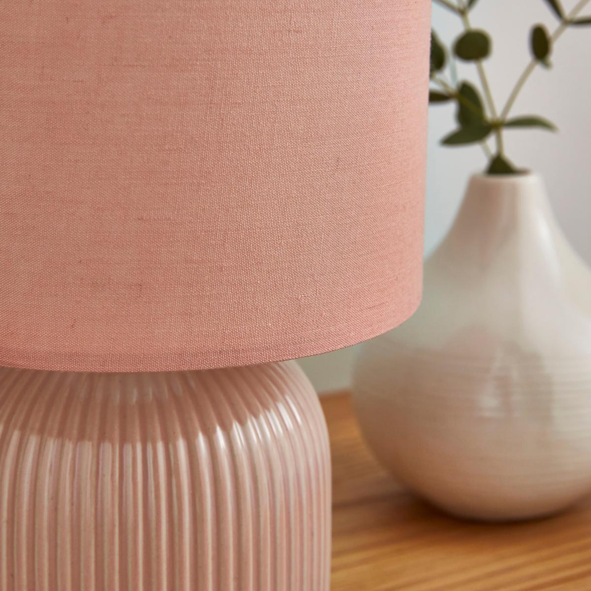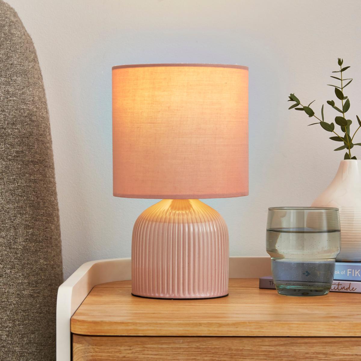Ribbed ceramic base Contemporary design Soft fabric shade Line switch Available in a range of colours This great value contemporary table lamp is designed with a modern ribbed ceramic base and comes with a soft fabric shade. Easy to switch on and off with an in line switch, so there's no fuss in the dark to switch the lamp on. This table lamp is available in a range of colours to suit any home interior. Please note: Bulb not included