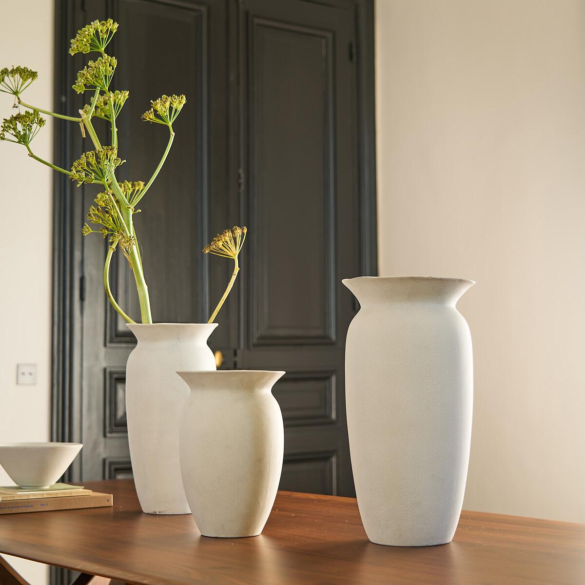 The Hedi vase in cracked earthenware offers a clean, understated silhouette that works beautifully in various interiors, from minimalist to rustic settings. I love how its subtle texture and neutral tone add a touch of natural warmth without overpowering a space. It’s versatile enough to hold fresh or dried flowers, or even stand alone as a sculptural piece. For styling tips, try pairing it with greenery or seasonal blooms for colour and contrast, and consider placing it on a console or side table to create a focal point. Its height makes it ideal for making an impact without overwhelming smaller surfaces, and its simple design ensures it complements rather than competes with other decorative elements.